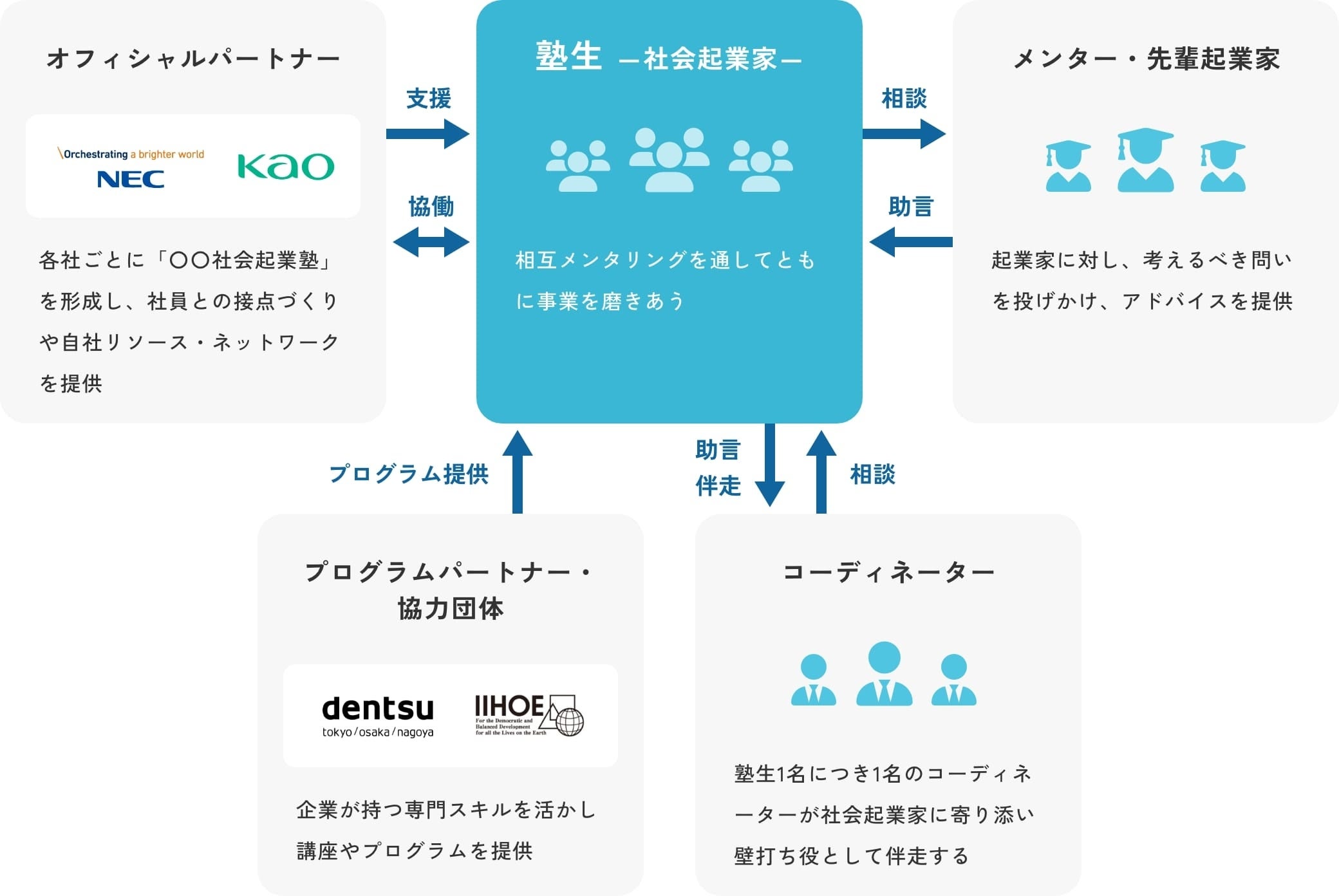 本プログラムには、卒塾生をはじめとした社会起業家、メンター、コーディネーター、パートナー企業・団体、事務局の5つのアクターが存在します。それぞれが自分たちの持つ強みや特性を生かして、社会起業家を支援しています。また起業家同士や、起業家とパートナー企業との協働事例も生まれており、新たな価値を提供しています。