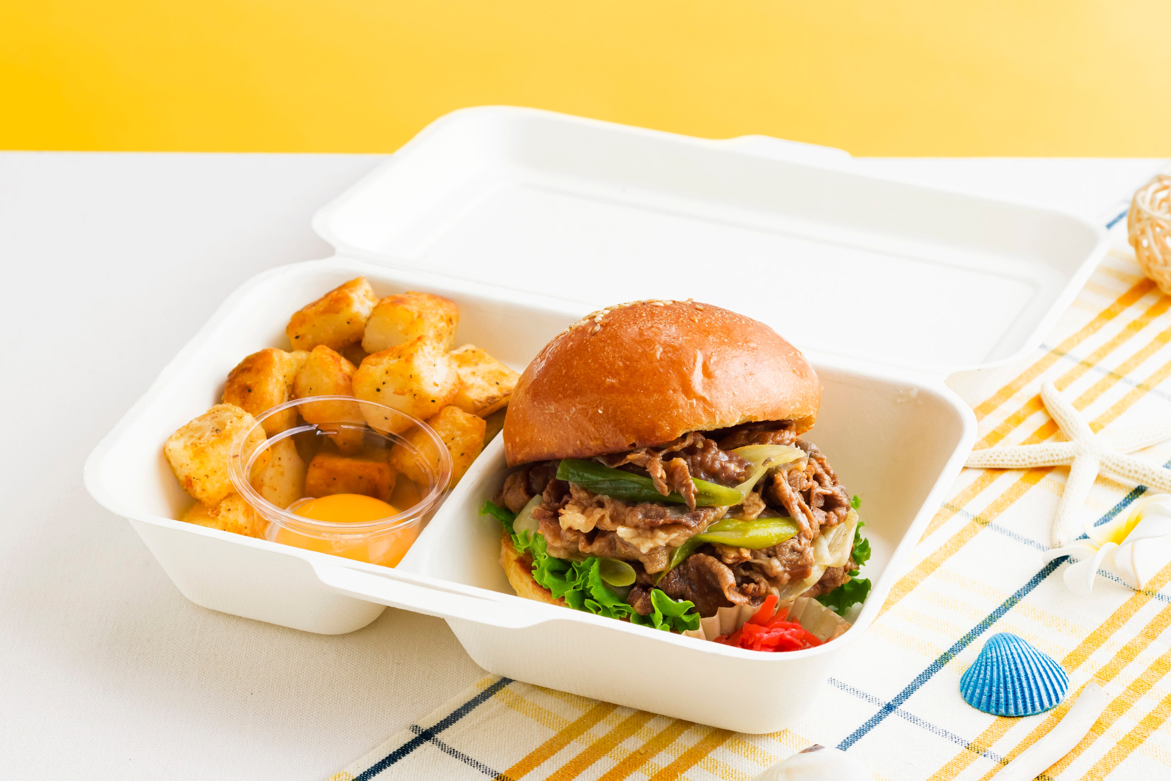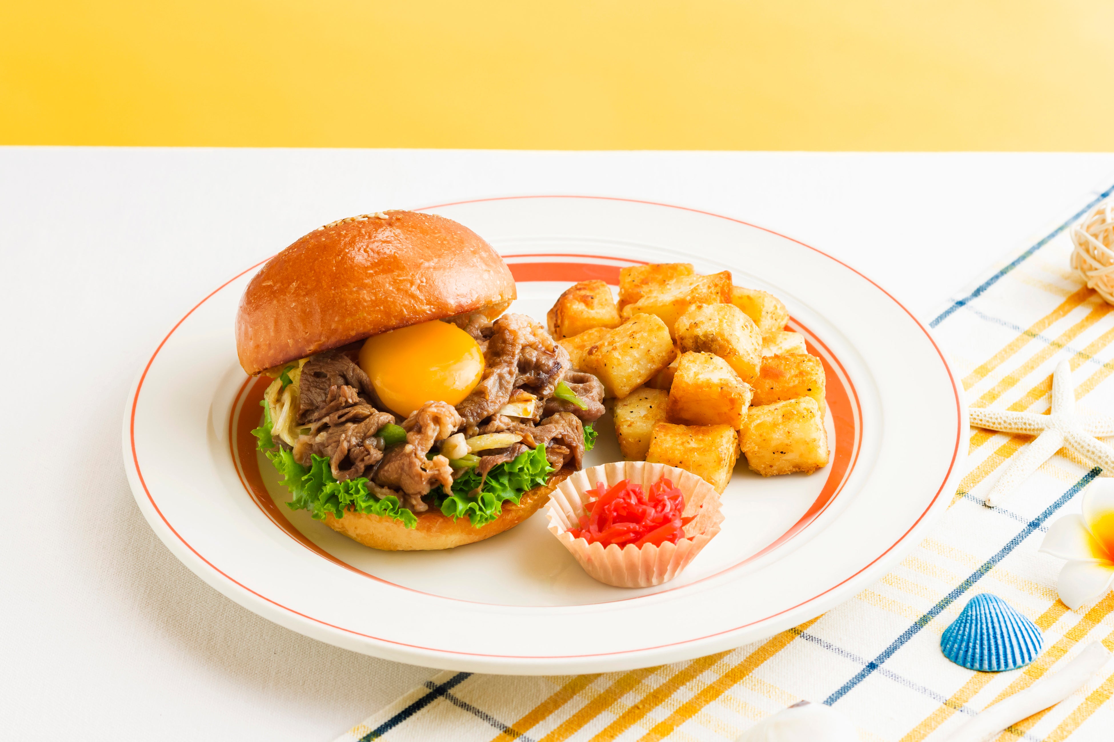 香り高いブリオッシュバンズに甘辛いすき焼きを挟んだ『黒毛和牛のSUKIYAKIバーガー』は紅しょうががアクセントになったボリュームたっぷりの一品です。