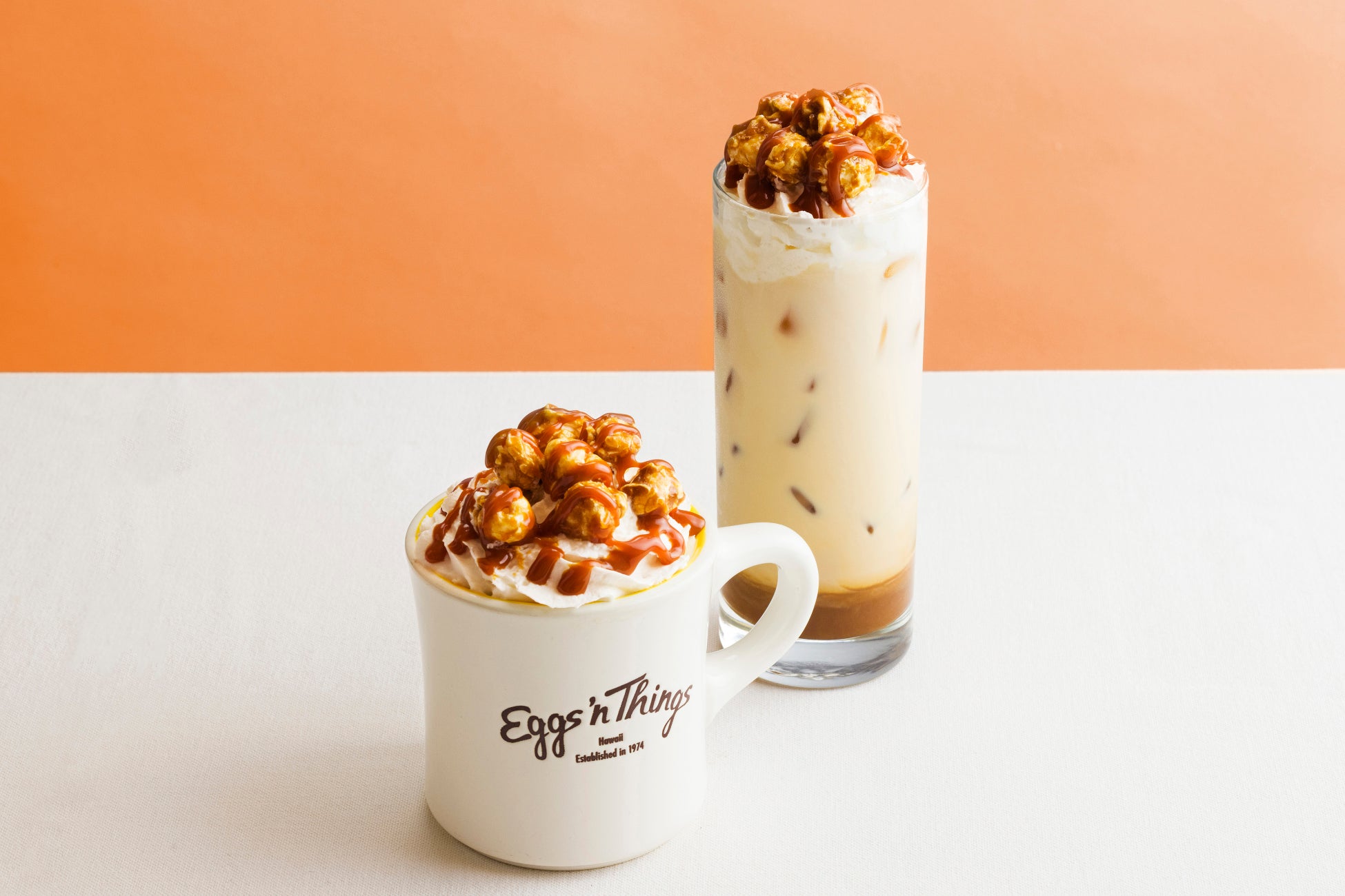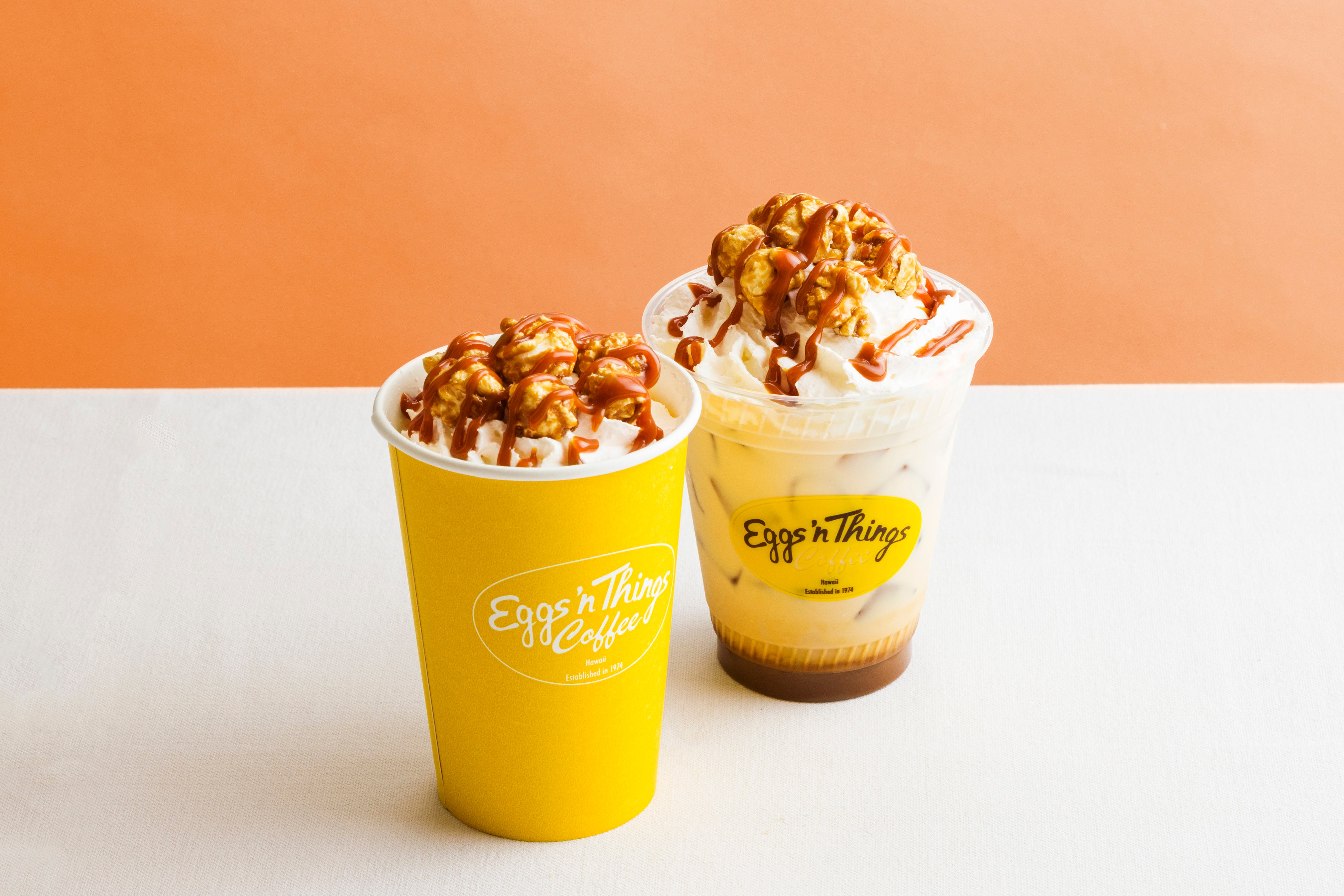 キャラメルとエスプレッソの香りが広がるラテにホイップクリームとキャラメルポップコーンを加えました。