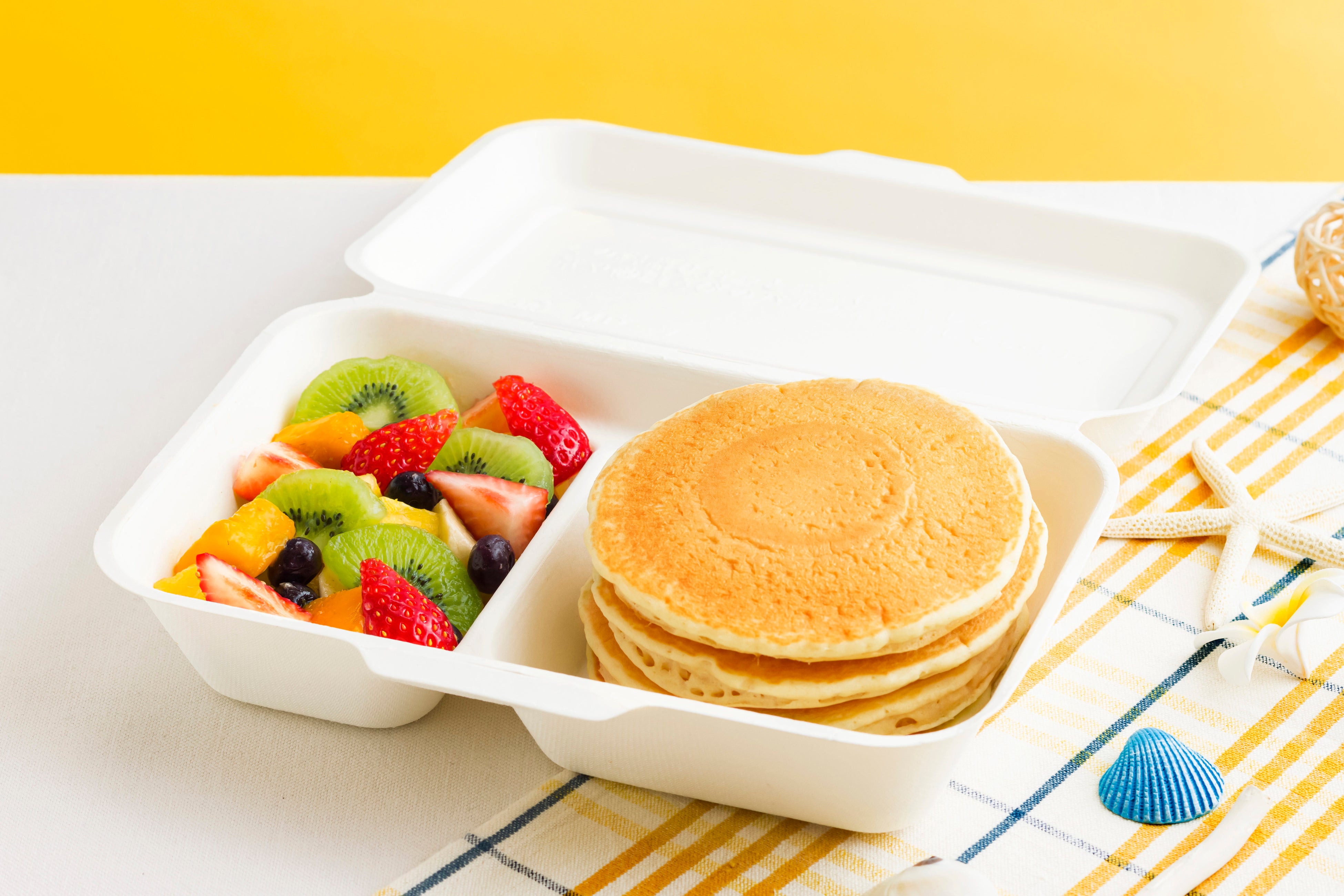 ジューシーなフルーツと甘さ控えめなふわもちパンケーキをお楽しみください