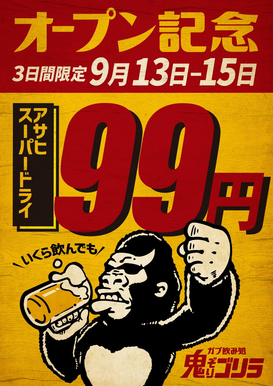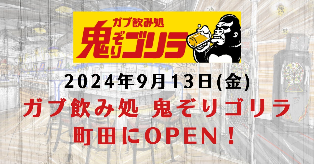 「"楽しい"でつながる世界をつくる」飲食企業である株式会社ファイブグループ(本社:東京都武蔵野市 代表取締役社長:坂本憲史 以下ファイブグループ)は、9月13日(金)に東京都町田にて「ガブ飲み処 鬼ぞりゴリラ 町田店」をオープン、同日13日、14日、15日の3日間はオープン記念で生中ジョッキ99円キャンペーンを実施いたします。
