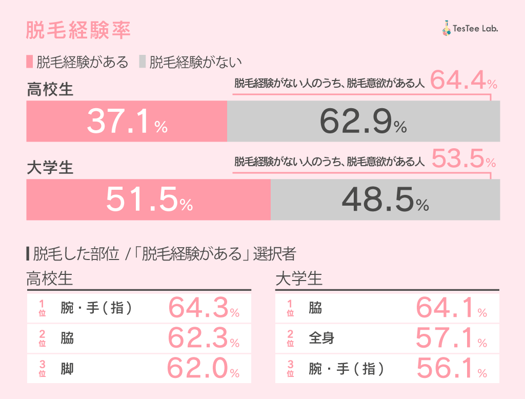 最初に、脱毛経験があるかどうかを調査したところ、「脱毛経験がある」と回答した人は高校生で37.1%、大学生で51.5%となりました。