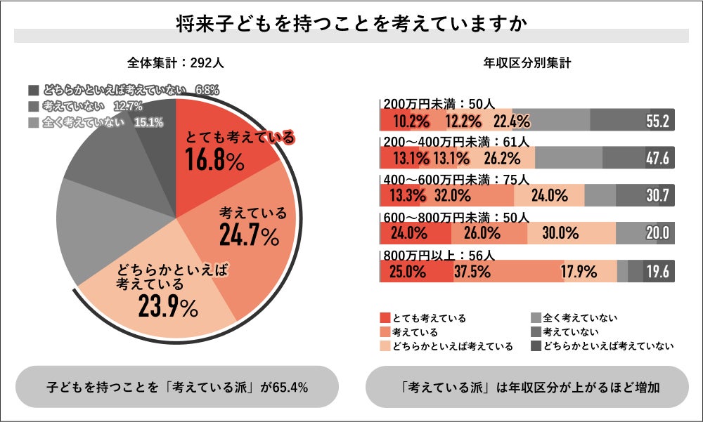 回答者全体の292人に将来子どもを持つことを考えているかを聞くと、「考えている派」が65.4%で過半数を占め、内訳は「とても考えている」16.8%、「考えている」24.7%、「どちらかといえば考えている」23.9%でした。「将来子どもを考えている派」の年収別回答では、800万円以上が80.4%で最多となり、次いで600万円~800万円未満が80.0%、400~600万円未満が69.3%、200万円~400万円未満が52.4%、200万円未満が44.8%の結果になりました。