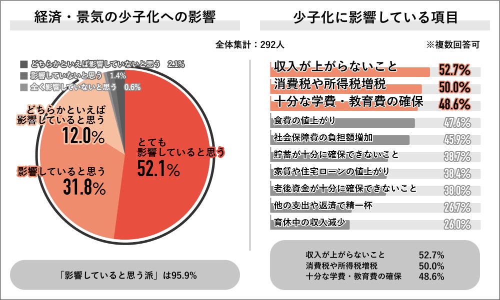 ・全体の95.9%が経済・景気は「少子化に影響」 影響の背景には「上がらない収入」が最も関係
