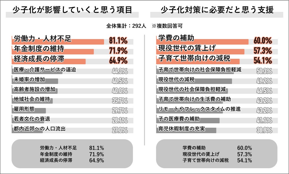 回答者全体の292人に今後少子化はどのようなことに影響していくかを聞くと、上位3つは「労働力・人材不足」が81.1%で最多、次いで「年金制度の維持」が71.9%、「経済成長の停滞」が64.9%となりました。同回答者に少子化対策に必要だと思う支援を聞くと、上位3つは「学費の補助」が60.0%で最多、次いで「現役世代の賃上げ」が57.3%、「子育て世帯向けの減税」が54.1%となりました。