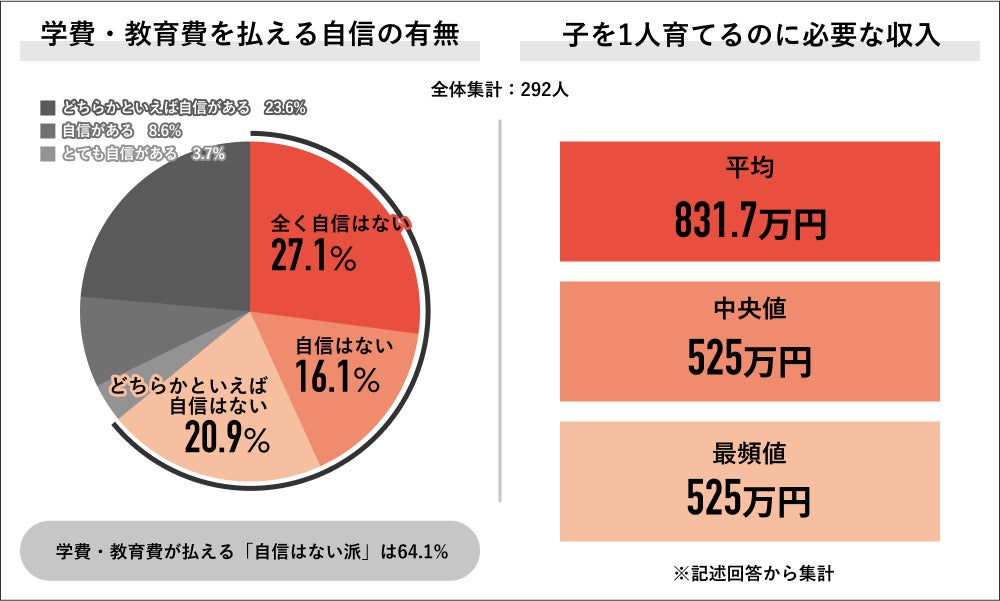 回答者全体の292人に現収入で学費・教育費を払える自信を聞くと、「自信はない派」が64.1%で過半数を占め、内訳は「全く自信はない」27.1%、「自信はない」16.1%、「どちらかといえば自信はない」20.9%でした。同回答者に1人あたりの子育てに必要だと思う最低限の収入額を聞くと、平均が831.7万円、中央値が525万円、最頻値が525万円となりました。