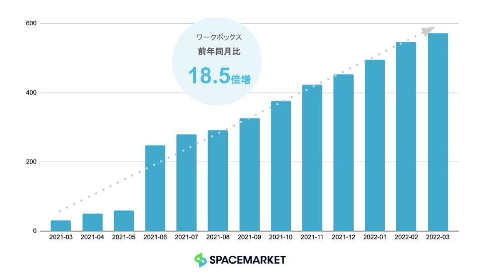 全国19,000件以上のスペースを掲載する「スペースマーケット」では、平日の日中帯を中心に仕事のために1人で場所を借りる「ソロワーク」の利用が、前年同月比3.5倍(2022年1月現在)に増加しています。中でも1人で行うPC作業、WEB会議などの仕事に適したスペース「ワークボックス」の掲載数は前年同月比18.5倍となっています。