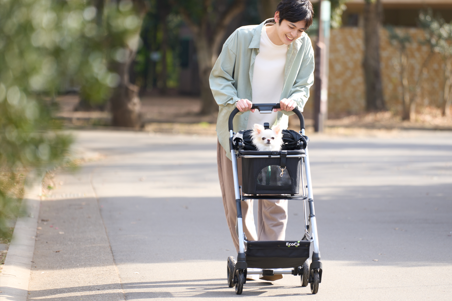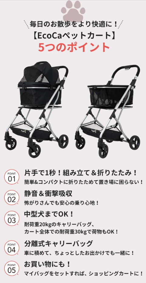 「EcoCaペットカート」は、EcoCaショッピングカートのご利用者様から最も要望の多かった「ペットを乗せたい!」というお声に応えた商品です。車輪が大きく衝撃吸収&静音設計の為、災害時のペットとの同行避難や避難所でのペットの居場所としても利用できます。片手でカンタンに組み立てや折りたたみができるEcoCaの機能はそのままに、ペット用だけではなく、ショッピングカートとしても使用できる画期的な3WAY高機能カートです。(※販売期間:2021年11月~2023年1月)