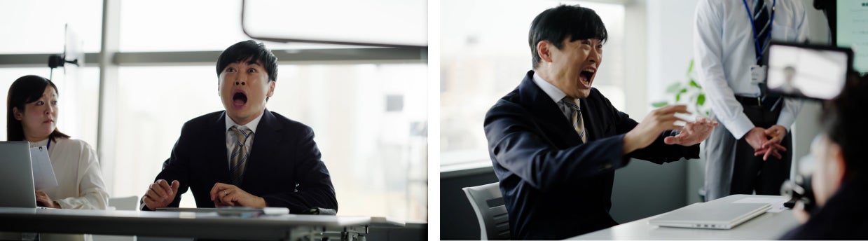 テレビでもお馴染みのフォーマルなスーツ姿で、撮影現場の執務室に現れた劇団ひとりさん。カメラが回る前から「DX担当部長」の役に入り、喜怒哀楽に合わせてシーンごとにガラッと変わるその表情が印象的でした。撮影シーンは執務室から屋上に。担当していたプロジェクトが失敗に終わってしまった後悔と怒りをぶつけるかの如く、3kgを超える重いハンマーを振り下ろしながら、様々な機材を「データ」として破壊していただきました。まさに怪演という表現が相応しく、その迫力に現場スタッフから思わず驚きの声が上がることも。朝からの長時間撮影にも関わらず、終盤になっても衰えることのない劇団ひとりさんのスタミナと力強い声に、SUPER STUDIOメンバーもパワーをいただきました。