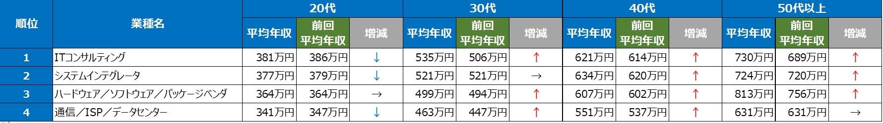 ■「IT/通信」業界に分類される4業種において年代別でみると、「20代」は減少、「30代」「40代」「50代以上」は増加傾向。二極化する結果に。