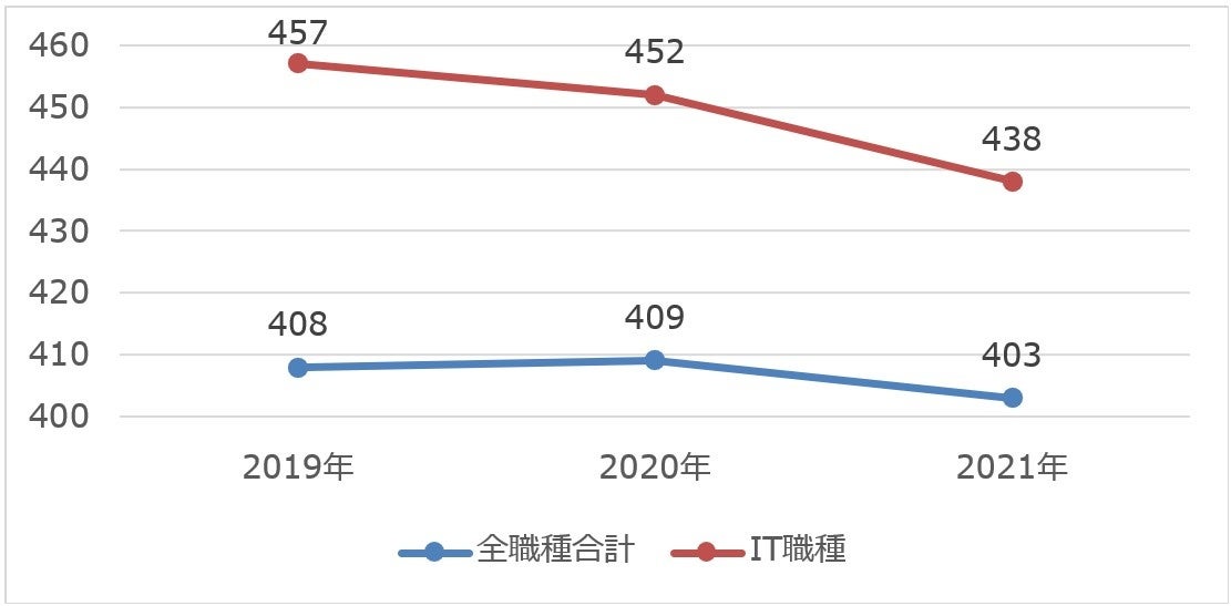 今年のIT職種の平均年収は438万円で、昨年から14万円減少しました。IT職種の平均年収額の推移をみると、2019年から2021年にかけて減少傾向にあります。しかし、全職種の平均年収と比較すると、IT職種の年収のほうが35万円高く、需要が高い職種であることが分かります。