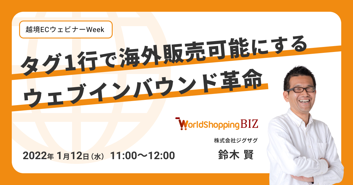 2022年1月11日~14日に開催されるオンラインセミナーイベント「越境ECウェビナーweek」内にて、ジグザグ 取締役の鈴木賢が、「タグ1行で海外販売可能にするウェブインバウンド革命」と題した講演を行います。