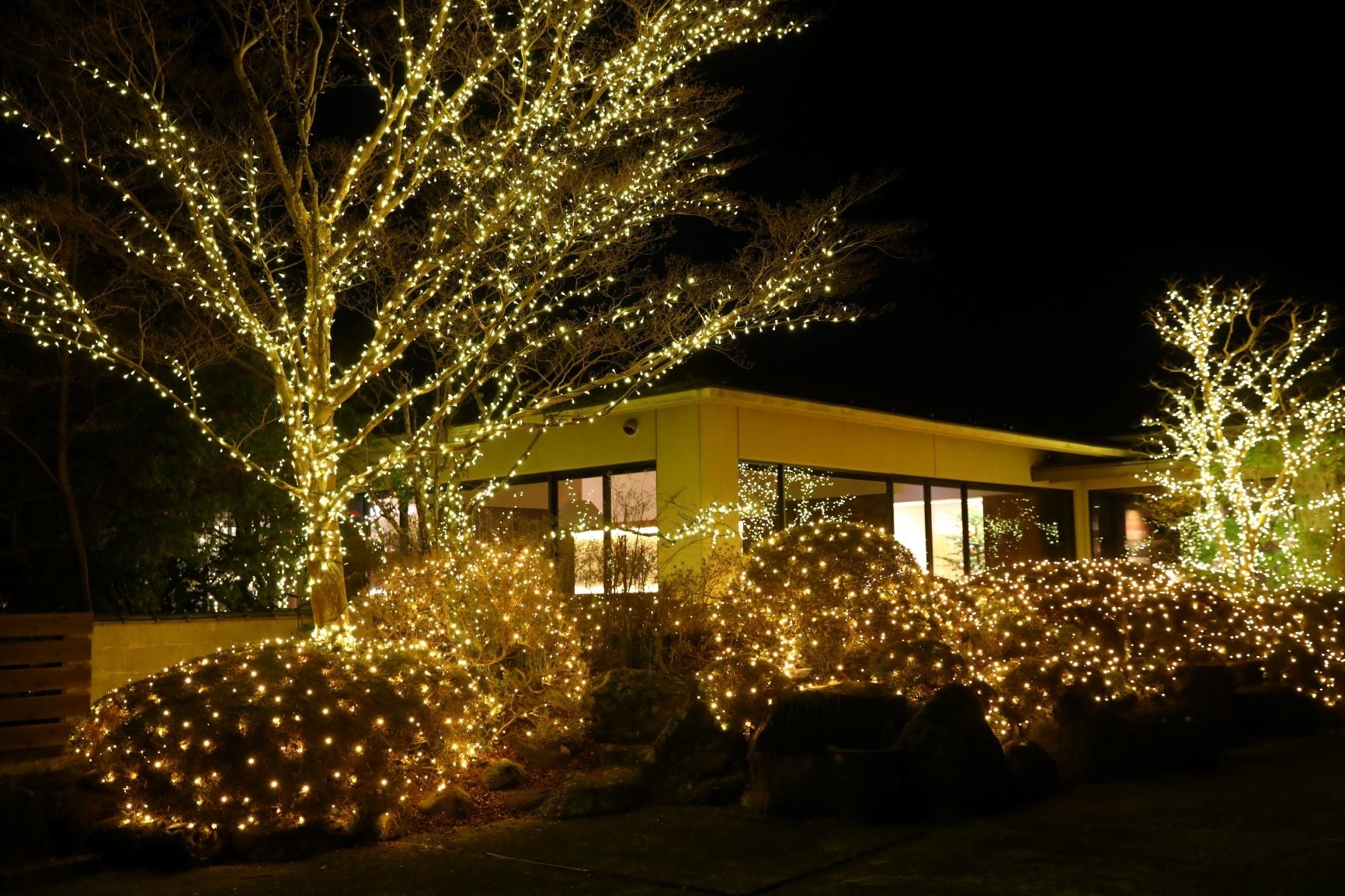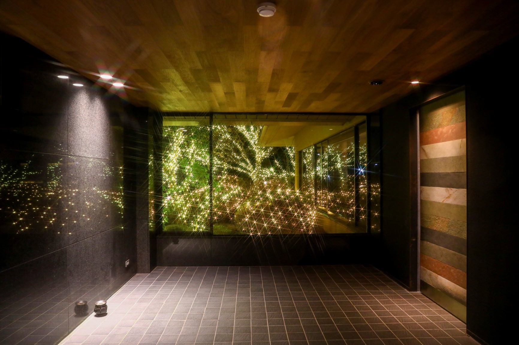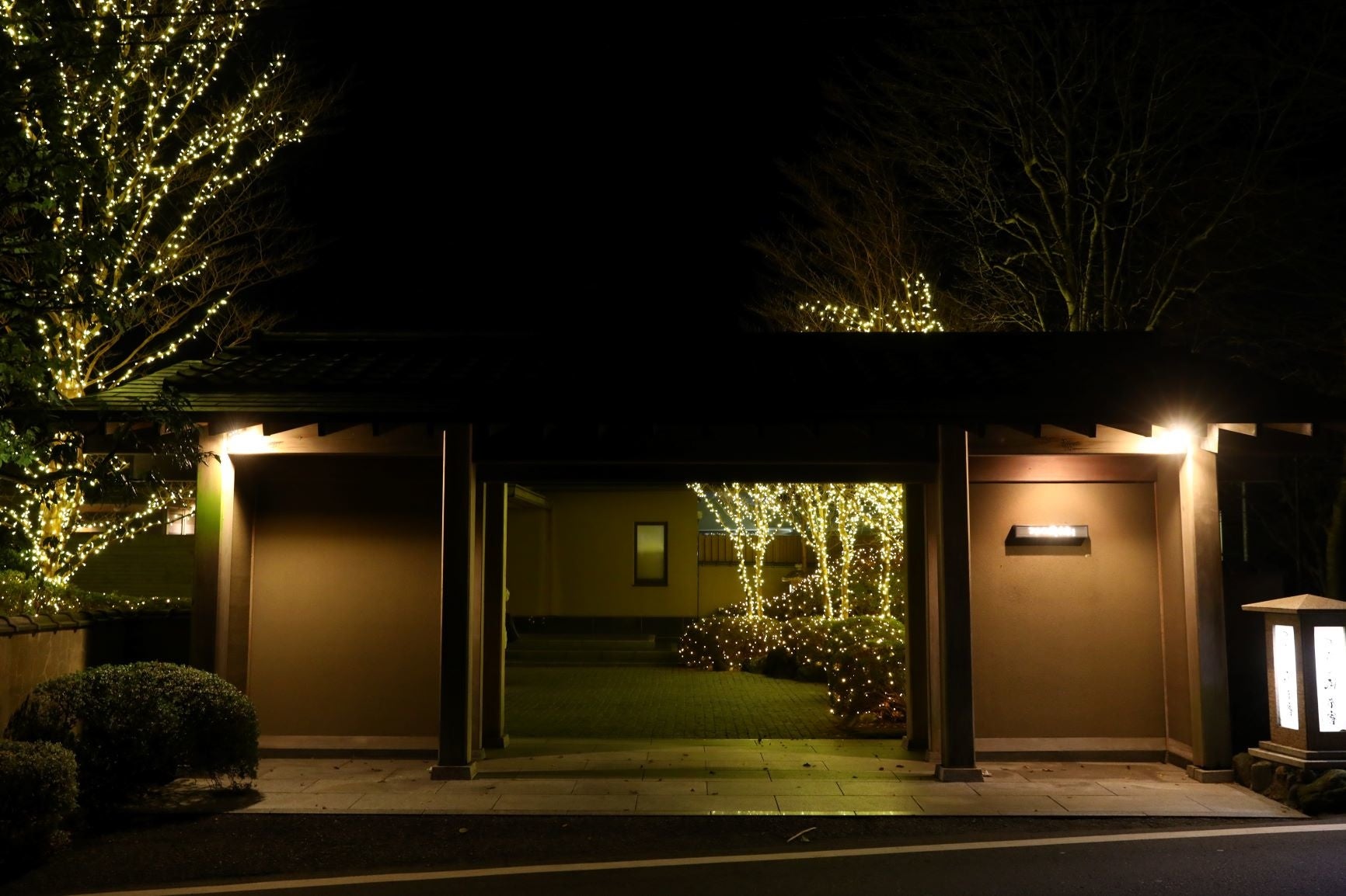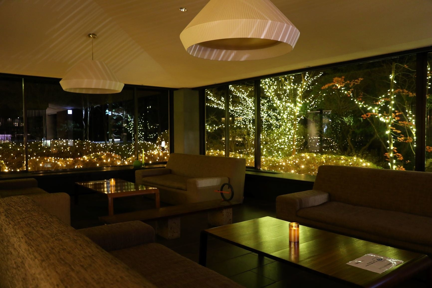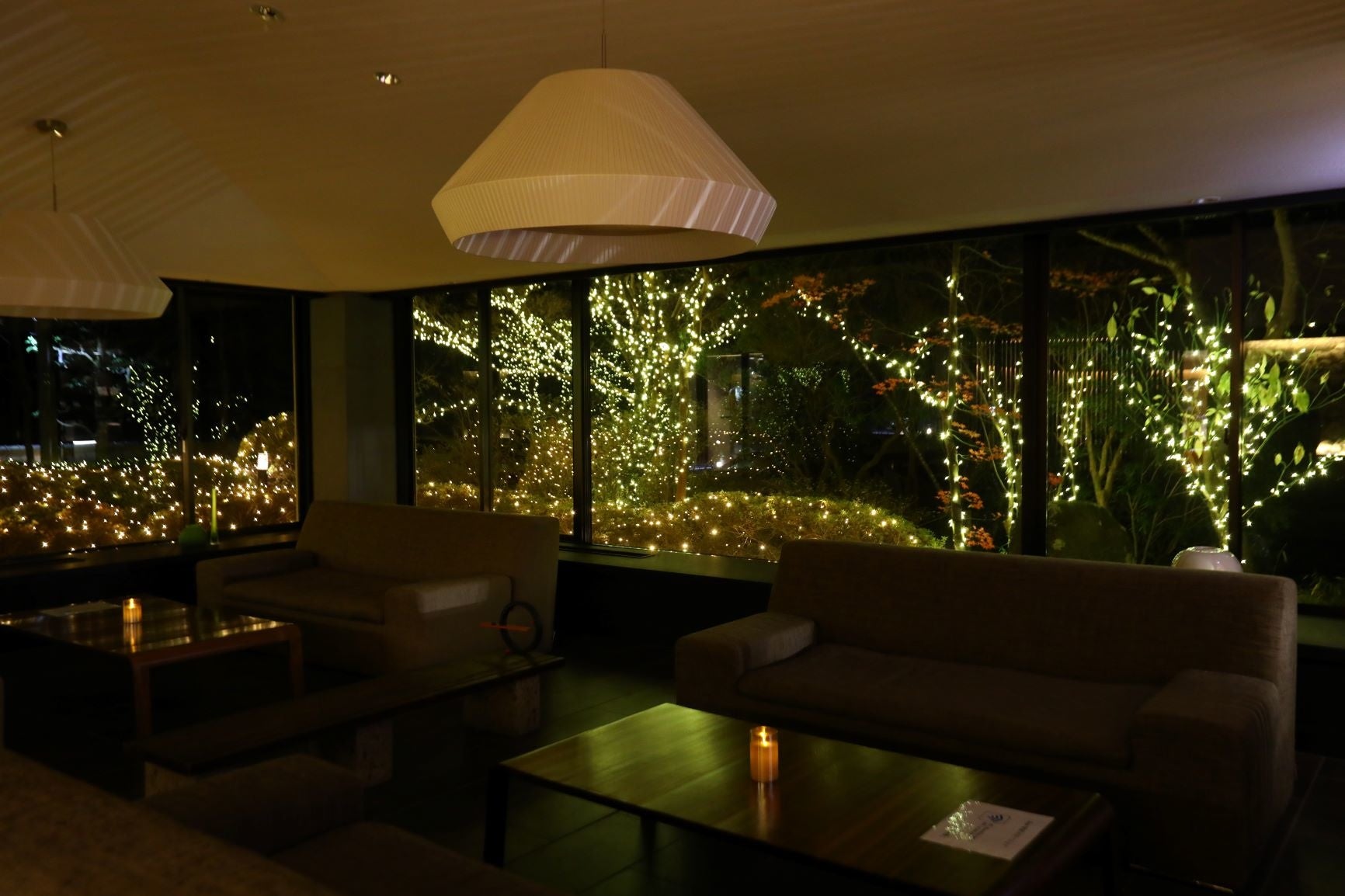 この度当館ではご宿泊頂くお客様に幻想的な世界観を味わって頂きたくイルミネーション企画を実施しております。玄関一面にシャンパンゴールドの鮮やかな装飾を施し、仙石原の静寂な冬にぴったりな特別企画でございます。ラウンジでは、白ワイン・スパークリングワイン・クラフトビール・ソフトドリンク・コーヒー・紅茶をご用意しておりフリードリンクとしてイルミネーションをご覧頂きながらお召し上がり頂けます。