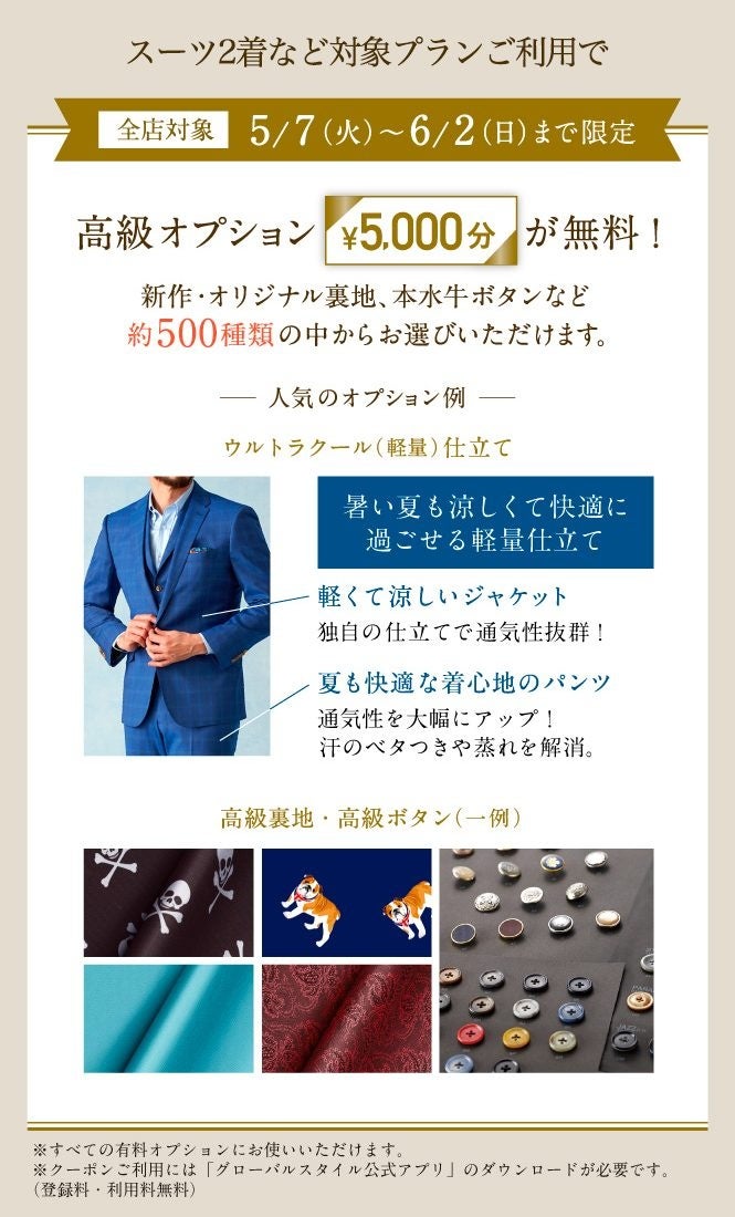 オーダースーツ専門店「グローバルスタイル」を運営するグローバルスタイル株式会社(東京証券取引所 スタンダード市場:7126、本社:大阪市中央区、代表取締役社長 田城弘志)は、人気のスリーピーススーツをお得に楽しめる「スリーピーススーツオーダーフェア」をリニューアルいたしました。さらに、オーダースーツ2着コンビプランご利用で5月7日~6月2日まで「高級オプションに使える5,000円分」のクーポンをプレゼント。