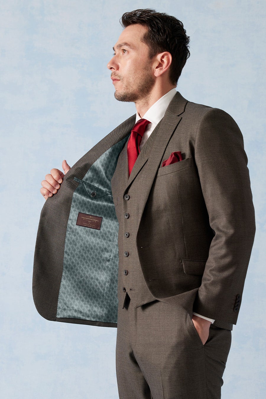ジャケット・ベスト・パンツがすべて同じ生地で仕立てられたスーツはスリーピース(三つ揃え)と呼ばれます。元々、スーツと言えばベストまで含めたスリーピースのことを指しており、ビジネスシーンだけでなく、結婚式・卒入園式・卒入学式などのセレモニーシーンでも人気のスーツスタイルです。