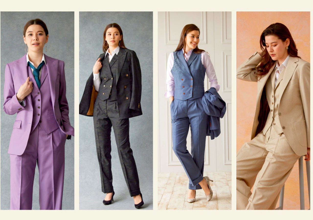 グローバルスタイルでは、メンズパターンをご希望の場合、女性のお客様でもスリーピーススーツをお仕立ていただけます。メンズライクな着こなしをどうぞお楽しみください。