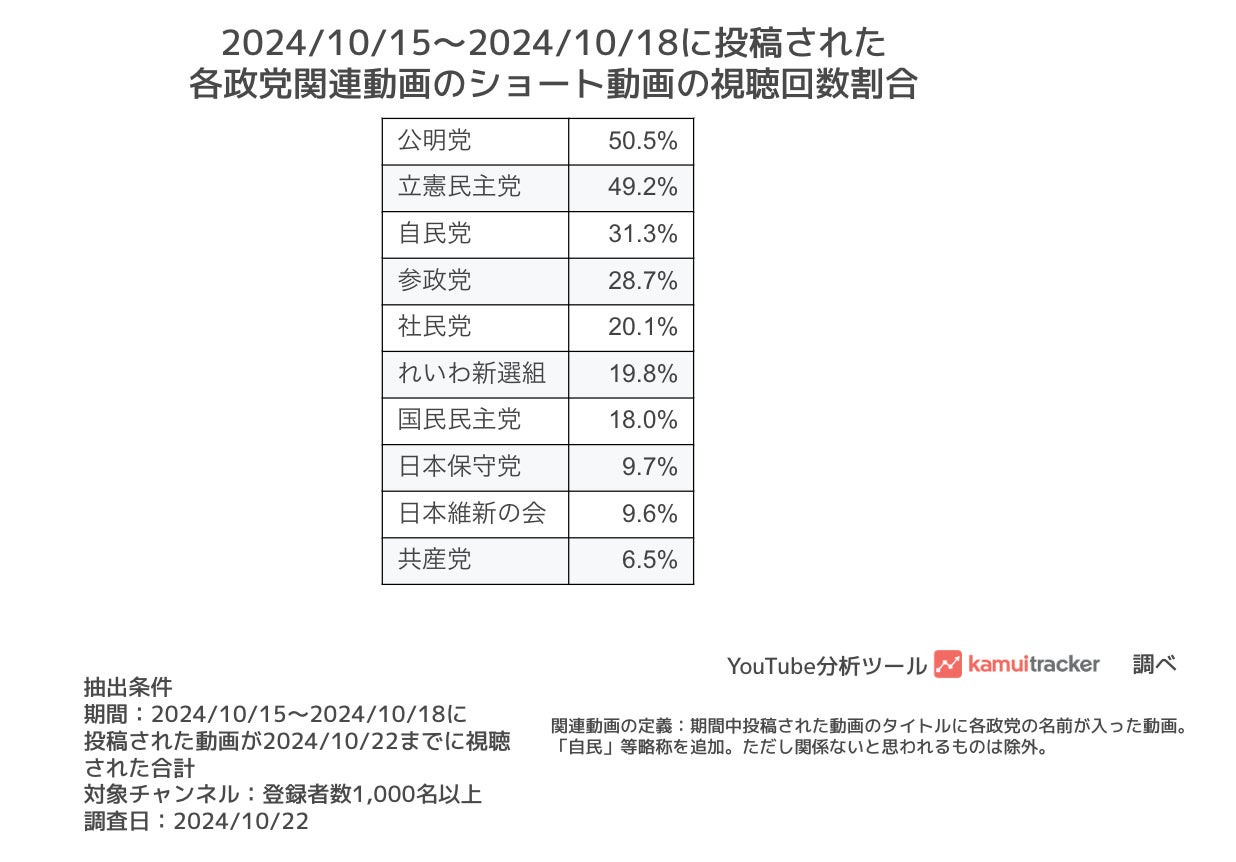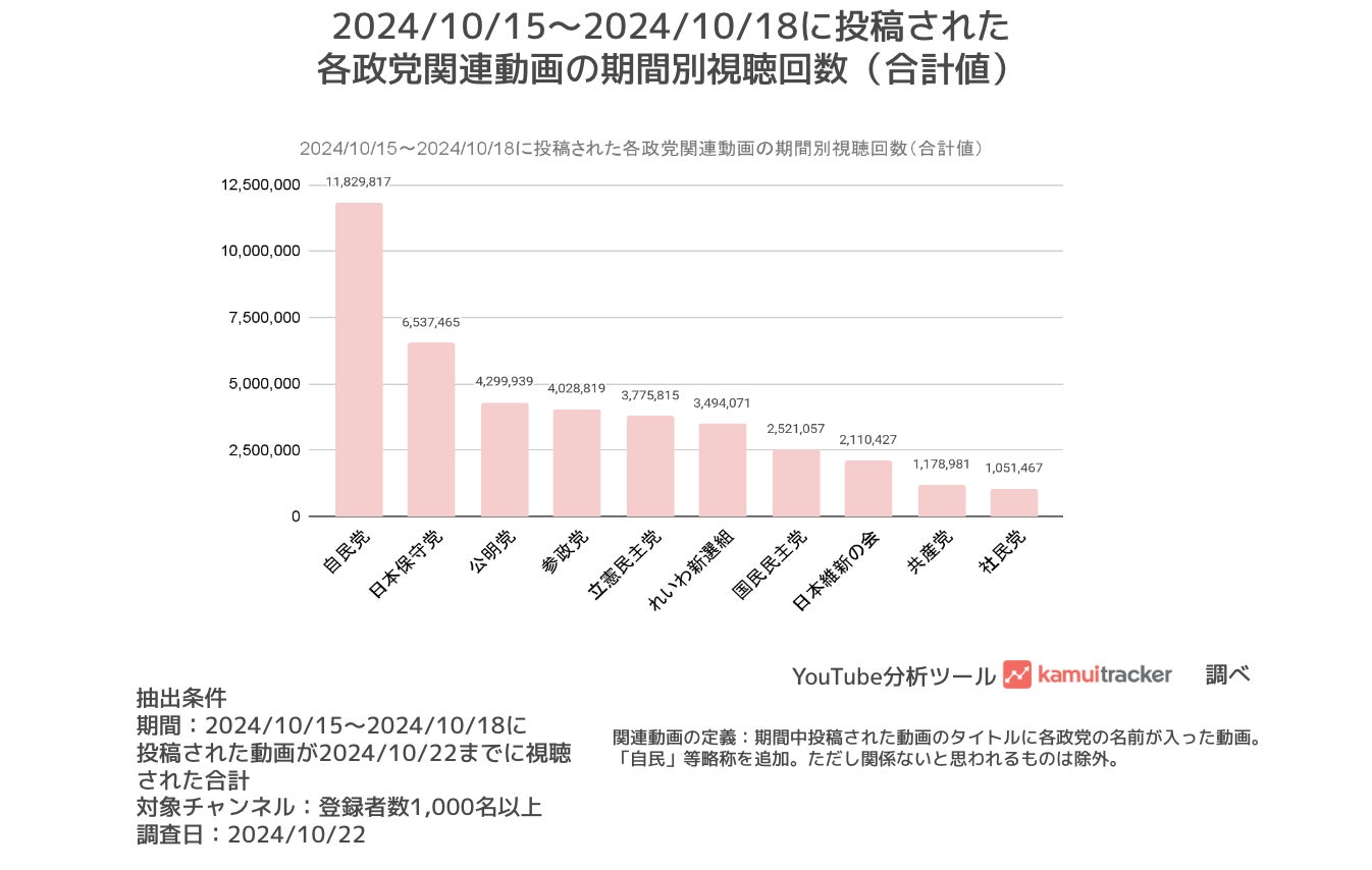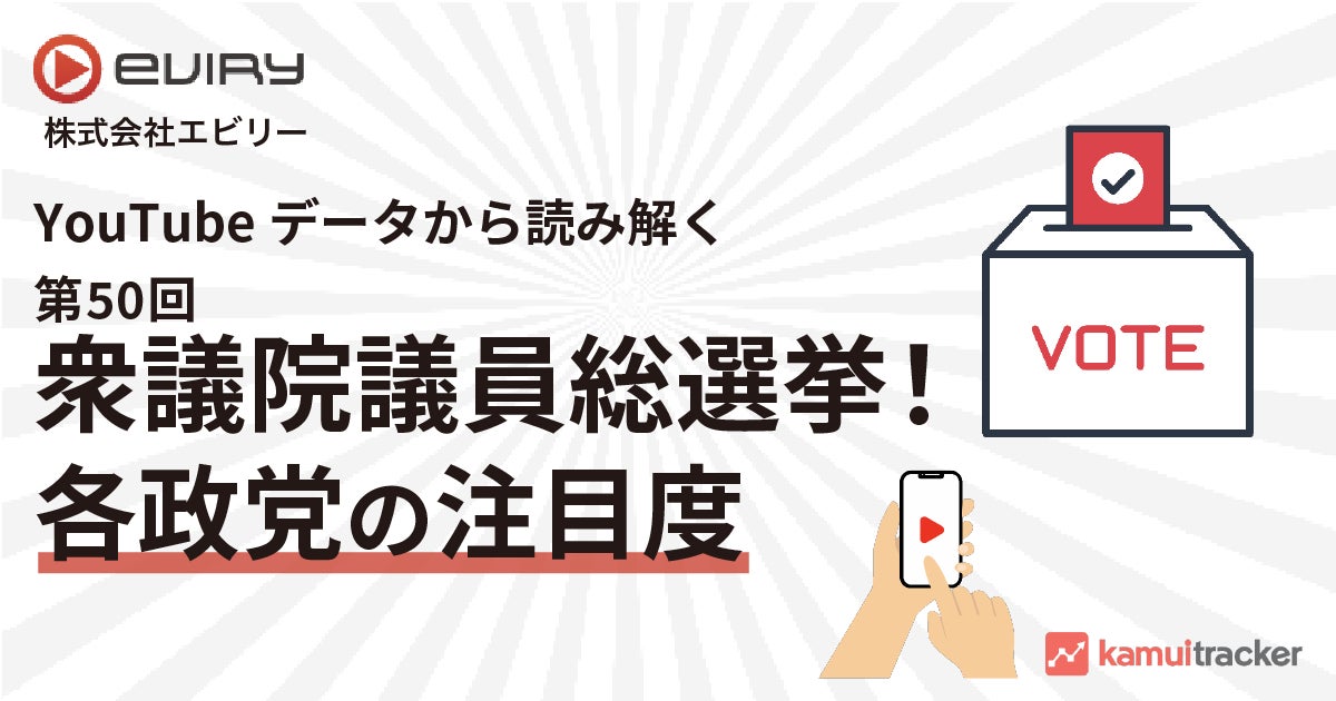 株式会社エビリー(本社:東京都渋谷区、代表取締役社長:中川恵介 以下、エビリー)は、10月27日(日)に開票が行われる第50回 衆議院議員総選挙(以下、衆院選)について、登録者数1,000名以上の国内YouTubeチャンネルの視聴データが分析できるkamui tracker(カムイトラッカー)を使って、YouTube上でどのくらい各政党が注目を浴びているのか分析しました。