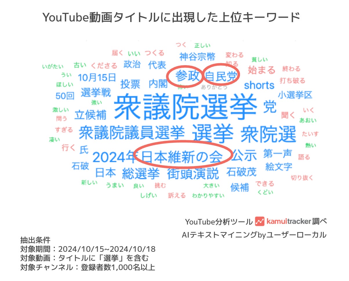 2024/10/15~2024/10/18に投稿されたYouTube動画タイトルに「選挙」を含む動画の中でもっとも多く使われた政党は、「日本維新の会」