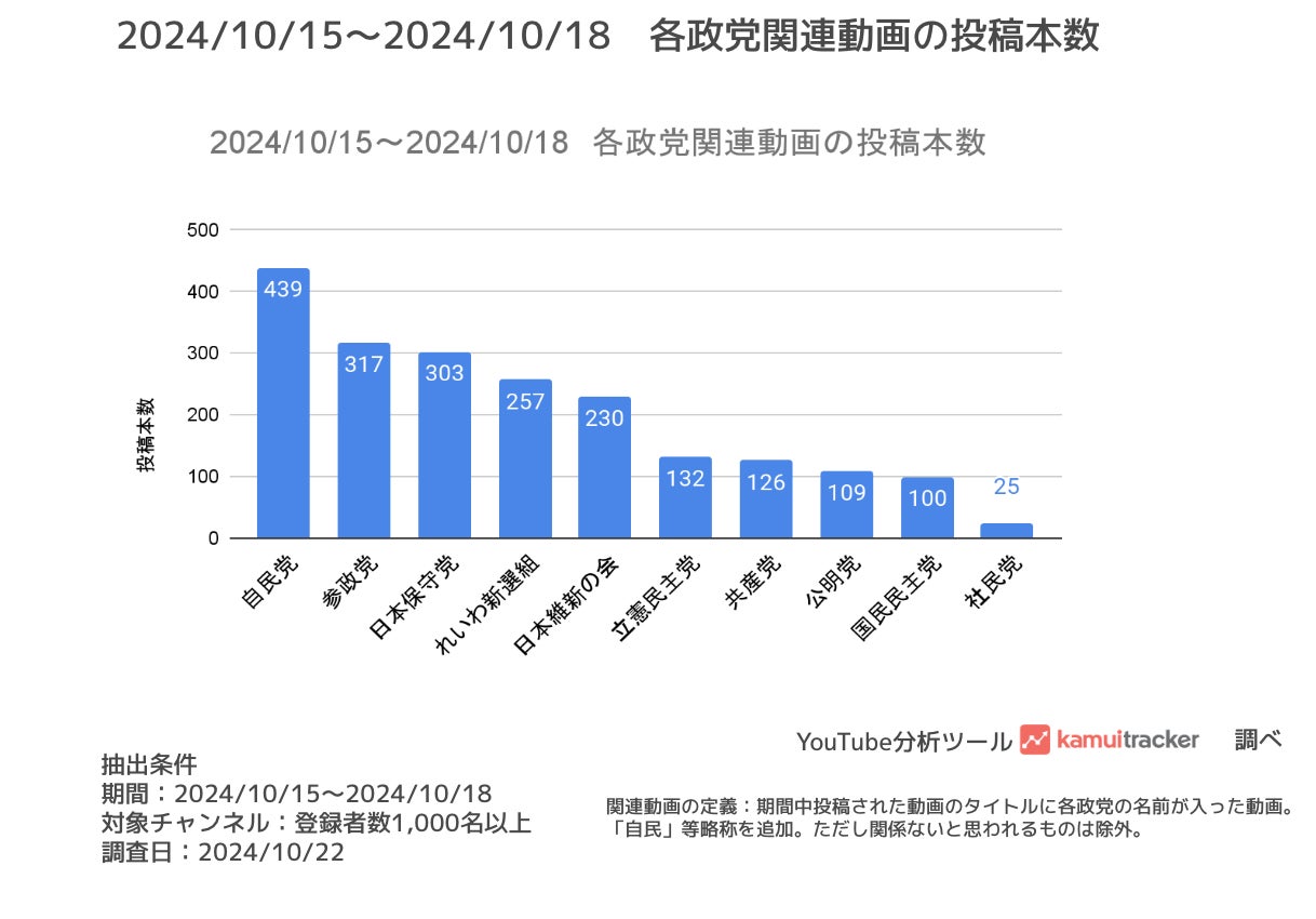 つぎに、公示日である2024/10/15から2024/10/18までの各政党に関する動画の投稿本数と視聴回数を調査しました。動画のタイトルに政党の名前が含まれるかどうかで関連動画を判定し、集計を行いました。