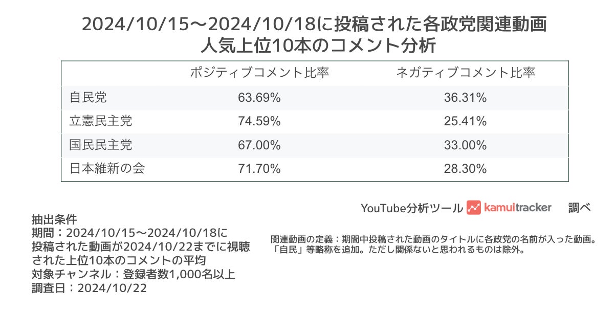 「自民党」「立憲民主党」「国民民主党」「日本維新の会」の関連動画で最も見られた上位10本の動画についたコメントがポジティブだったのかネガティブだったのかを調査しました。