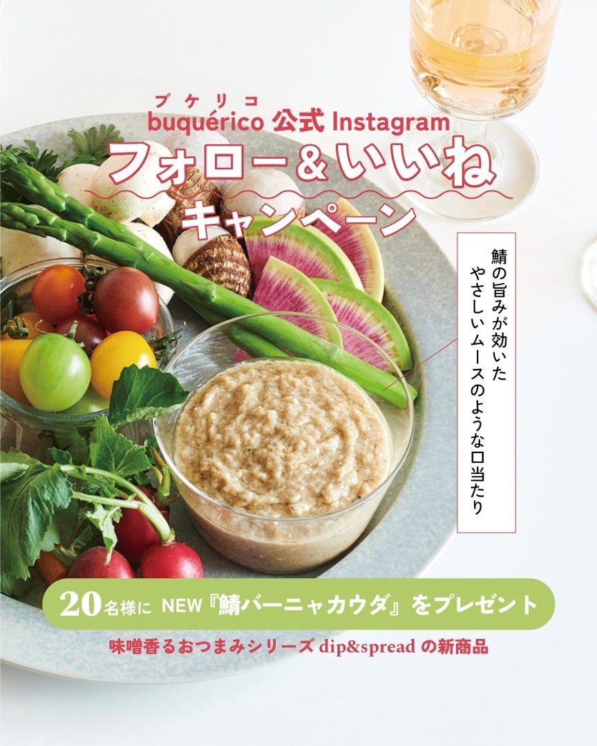 「鯖バーニャカウダ」の発売を記念し、『buquérico』公式Instagramにてフォロー&いいねキャンペーンを開催いたします。