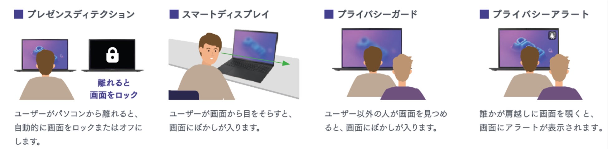 離席時の自動画面ロック機能や、画面を見ていないときに画面をぼかす機能、背後に人がいるとき画面上に警告を表示するなど、豊富なセキュリティ対策がされています。