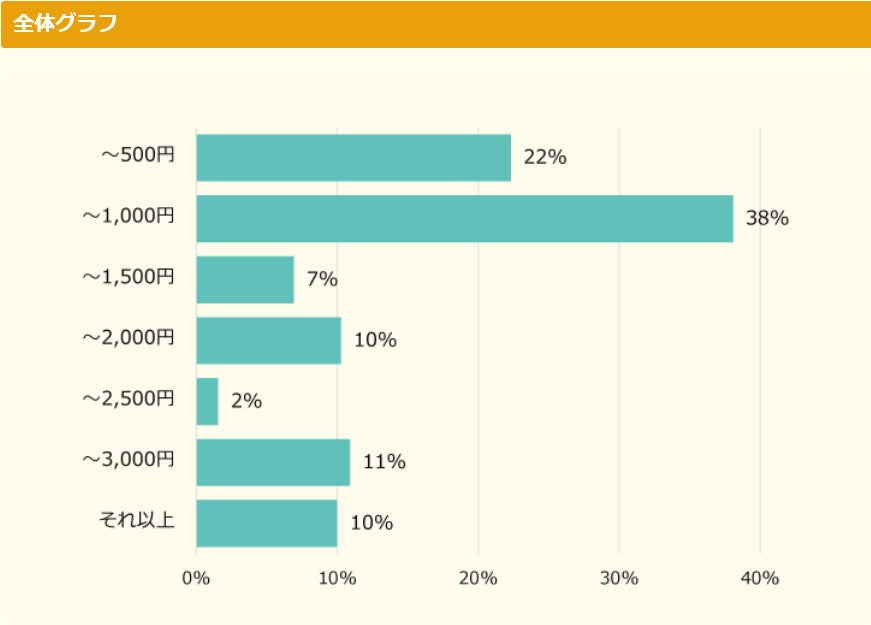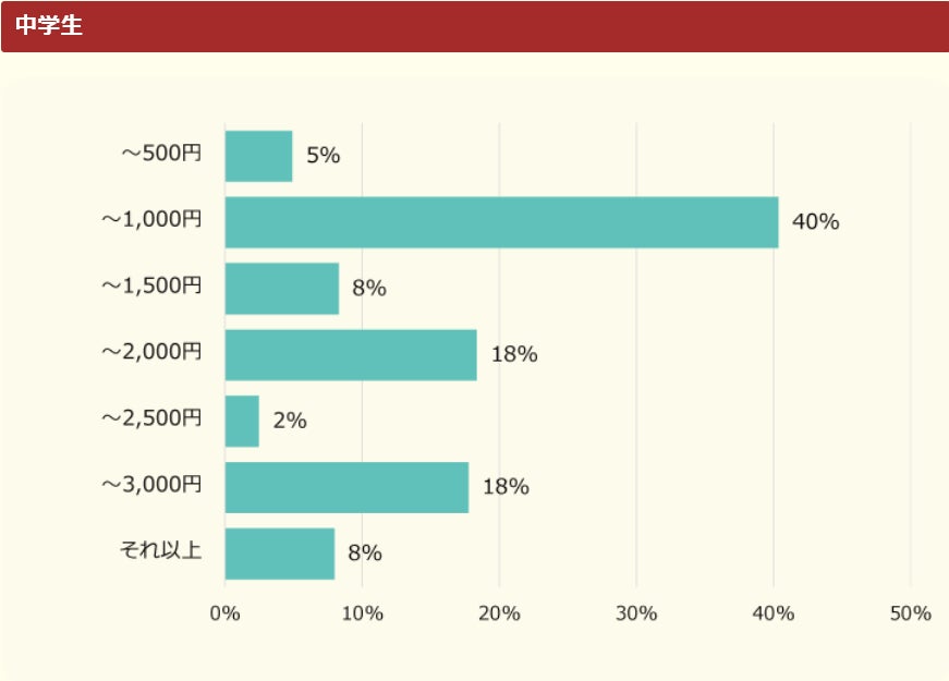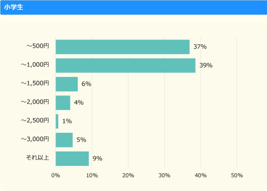 2番目に多かった回答は、小学生では「1~500円」、中学生では「1,501~2,000円」と「2,501~3,000円」でした。「3,000円以上」は小中学生とも1割以下でした。