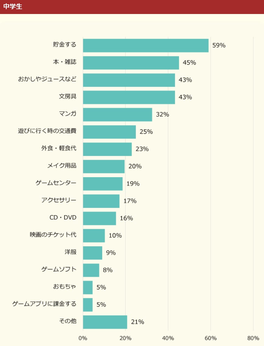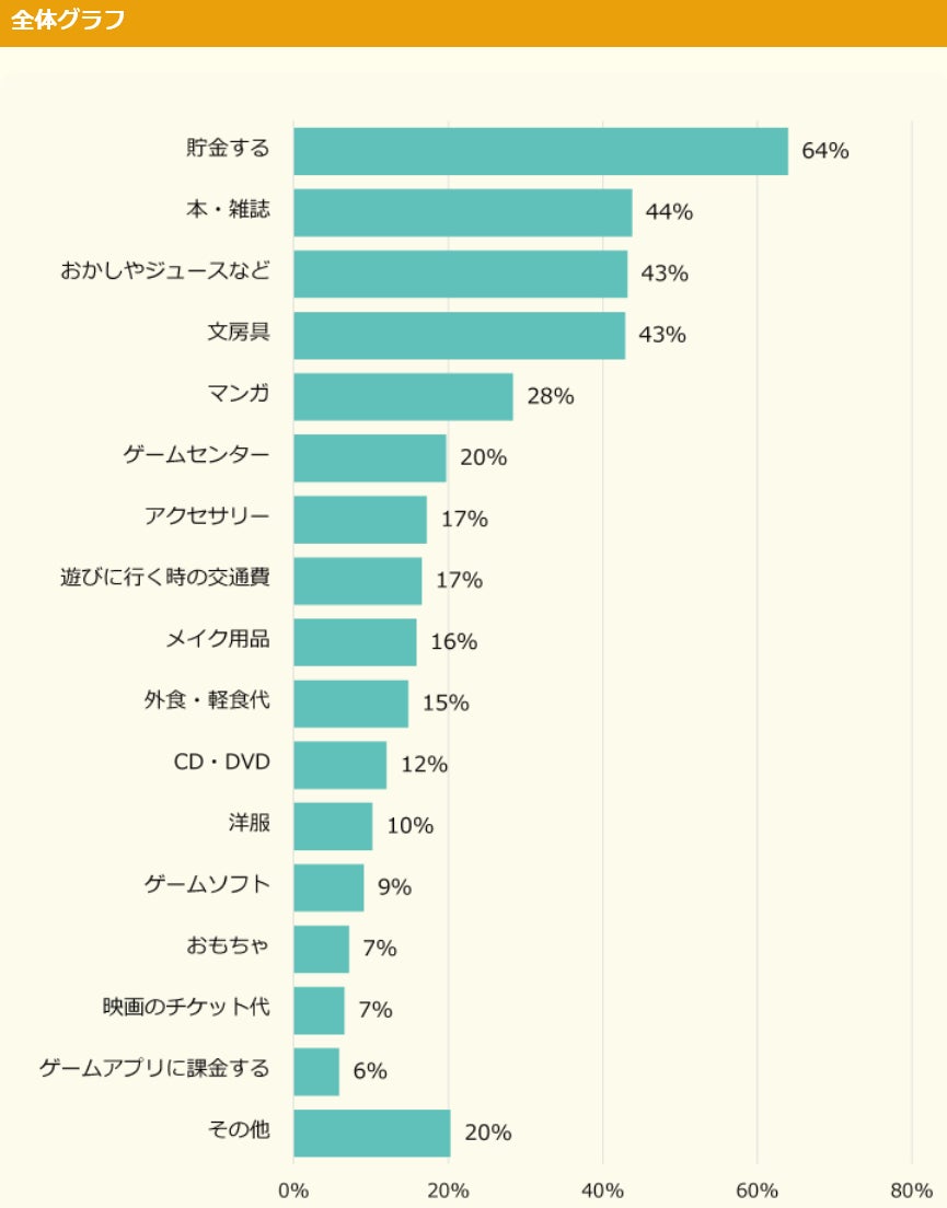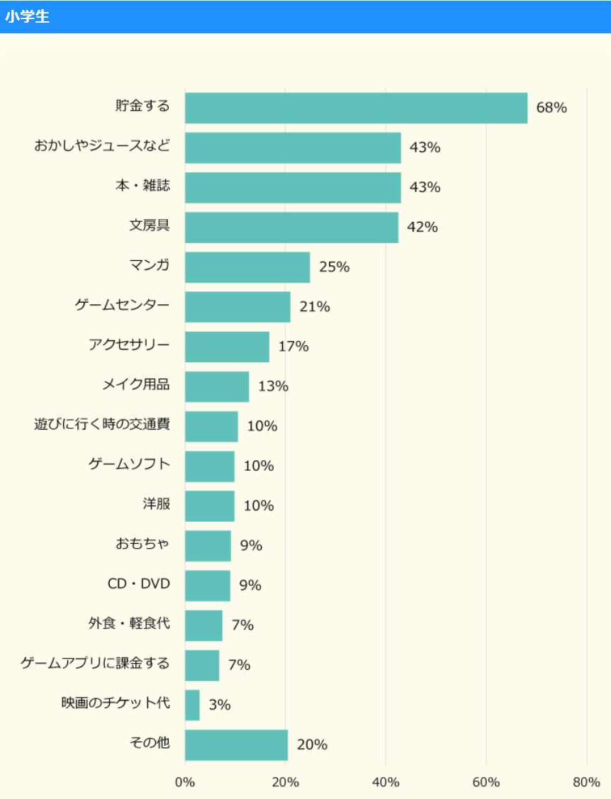 お金の使い道については、第1位が「貯金」で約6割を占め、次いで「本・雑誌」「おかしやジュースなど」「文房具」という結果でした。