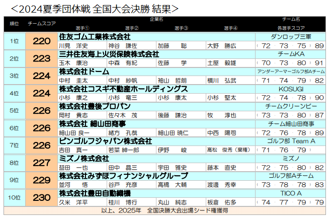 優勝:住友ゴム工業株式会社ダンロップ三軍チーム◆日本最大級の企業対抗ゴルフ大会第23回RELO CLUB全日本企業対抗ゴルフトーナメント「リクルートCUP2024夏季団体戦」全国決勝大会【リロクラブ】