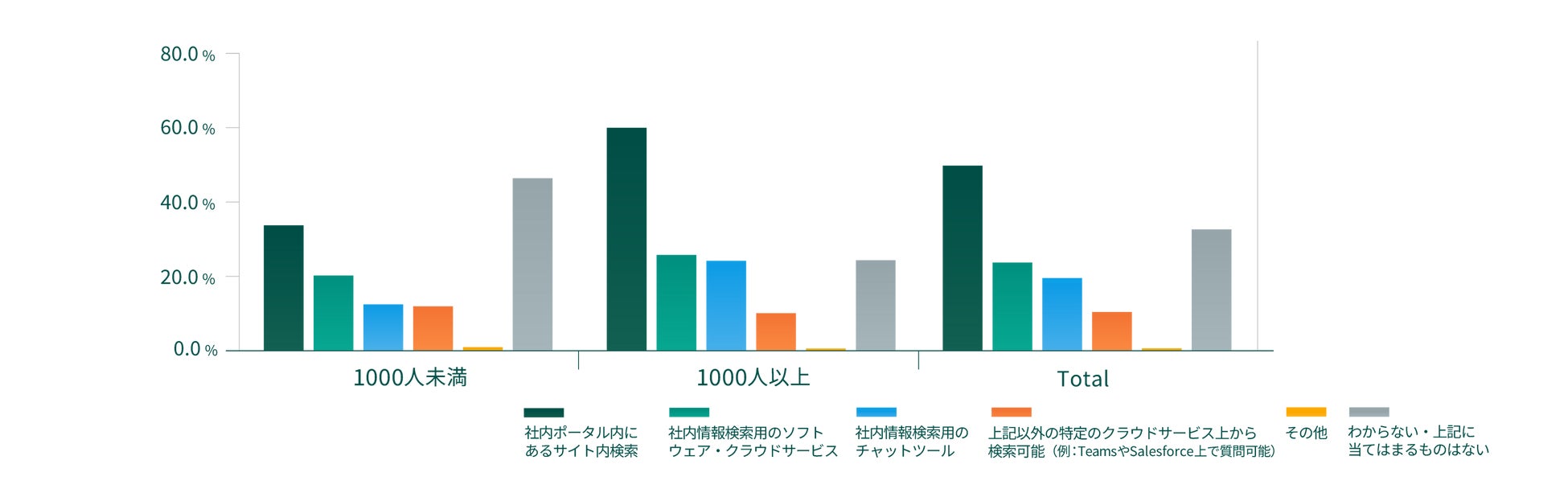 更に、大企業(従業員1,000名以上)においては、約6割が「社内ポータル」で検索しており、生成AIの登場により様々なツールが登場する一方で、「社内ポータル」から情報を探す文化は今もなお続いていることが分かります。