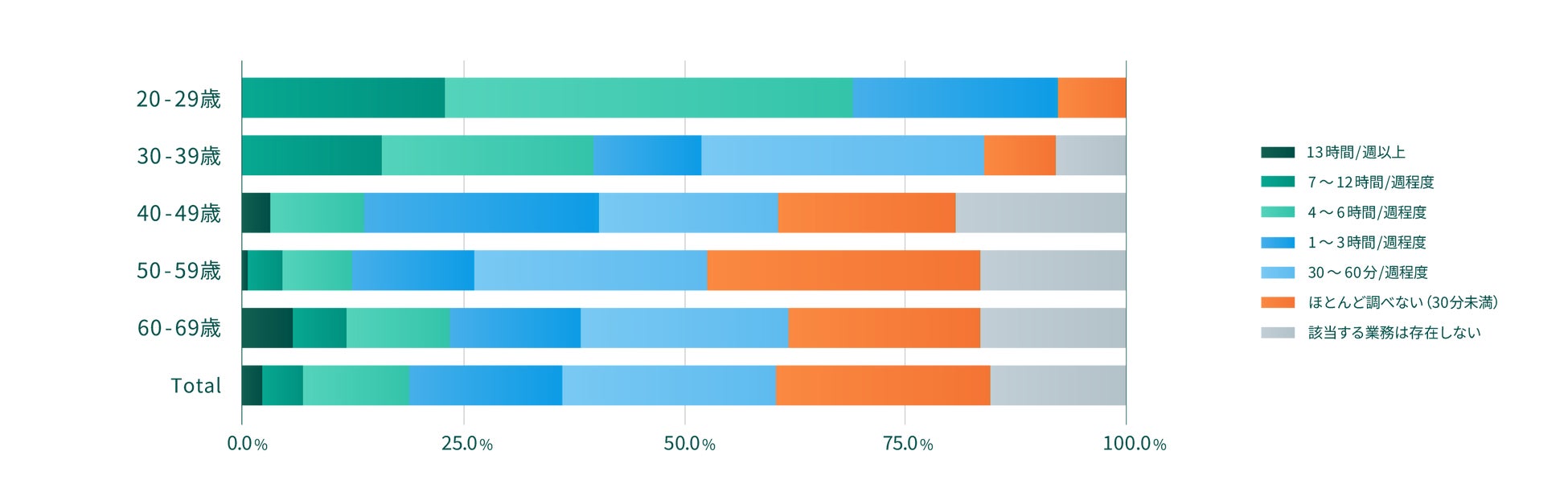 社内ナレッジ活用ツールを「導入済み」と回答した大企業に、ツールの利用時間について尋ねた設問では年代ごとに大きな差があることがわかりました。