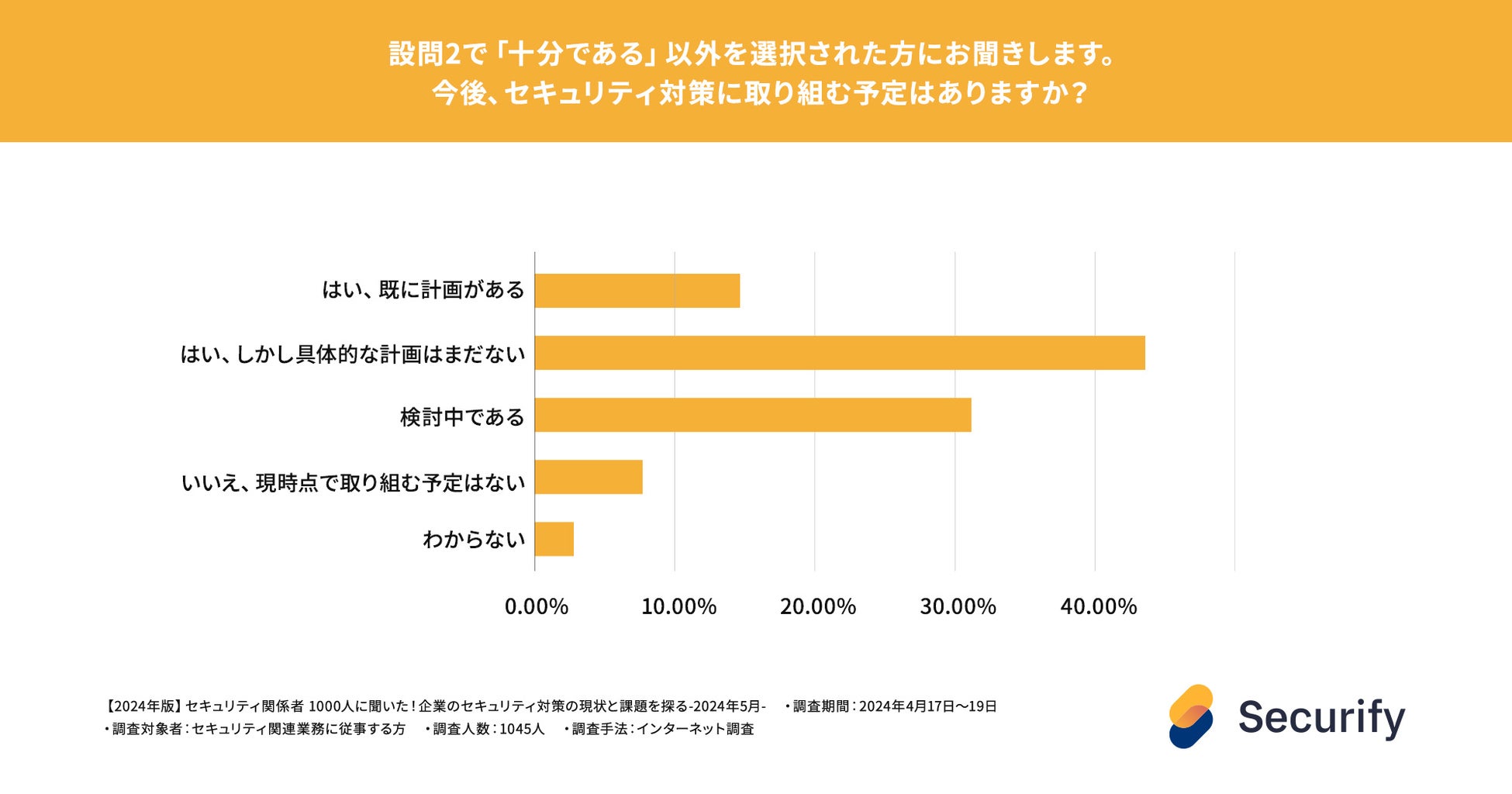 「はい、しかし具体的な計画はまだない」との回答が43.4%で最も多く、次に「検討中である」との回答が31.1%でした。多くの企業がセキュリティ対策の重要性を認識しているものの、具体的な対策計画の策定には至っていない状況が見られます。