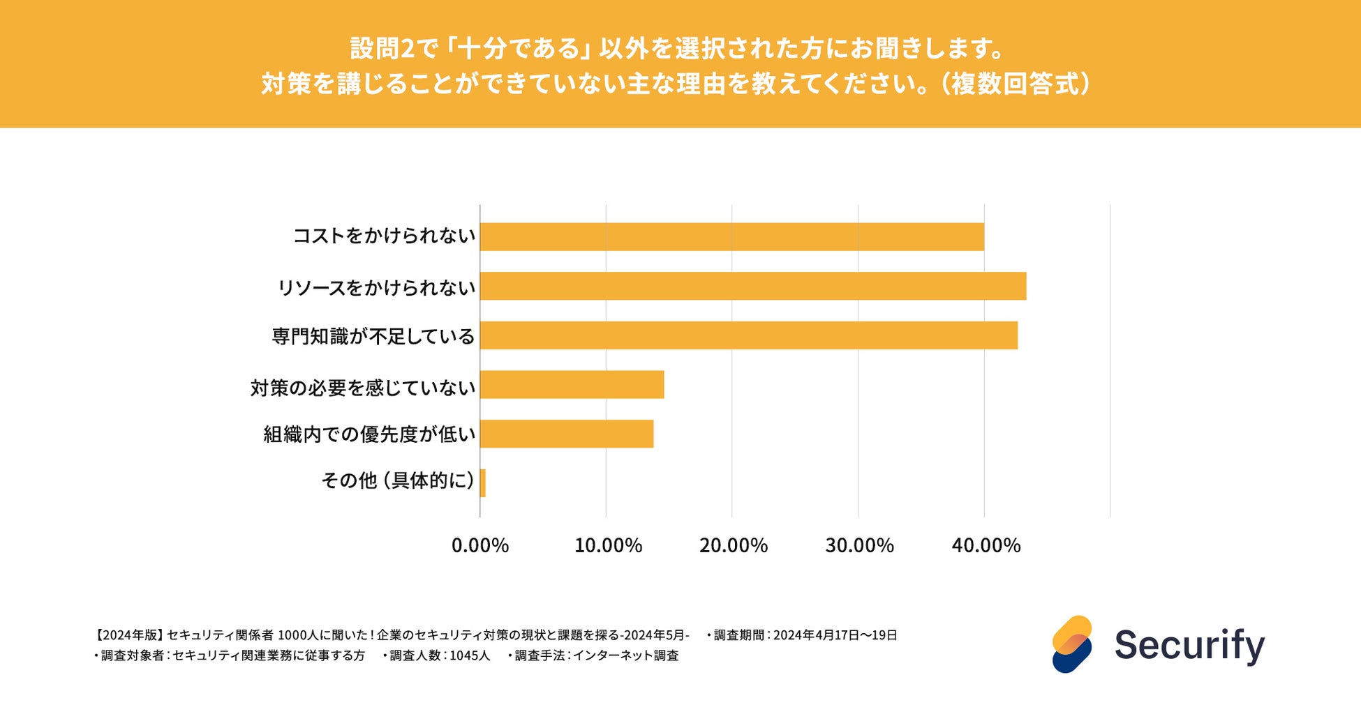 セキュリティ対策を十分に講じることができない主な要因は「リソース」、「コスト」、「専門知識」の不足