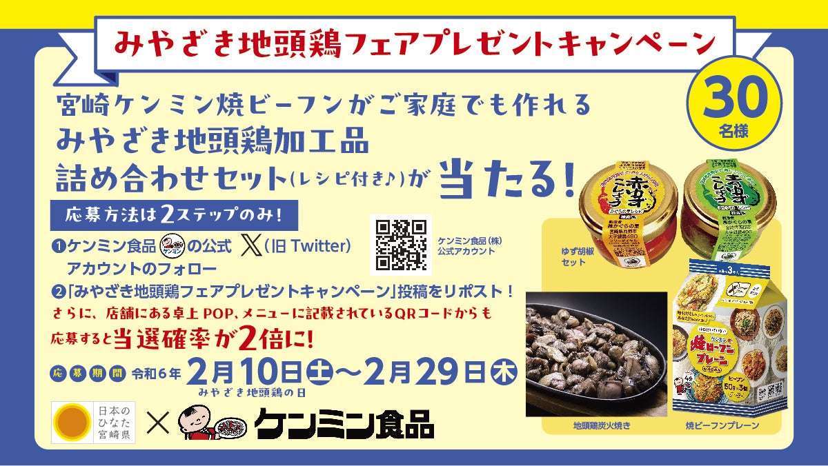 フェア期間中は、「味の付いていない ケンミン焼ビーフンプレーン」やゆずこしょうなどが入った、みやざき地頭鶏加工品詰め合わせセットを30名さまにプレゼントするキャンペーンも実施します。
