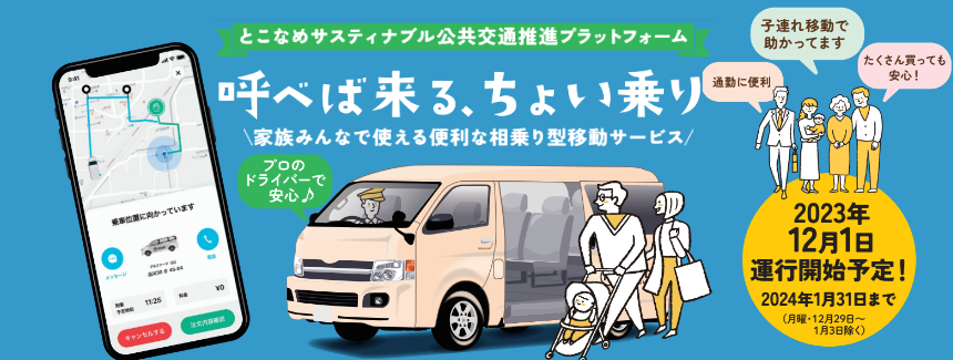 ※本事業は、国土交通省の「令和5年度 共創モデル実証プログラム」の採択を受け、「とこなめサスティナブル公共交通推進プラットフォーム」を立ち上げ、実施します。
