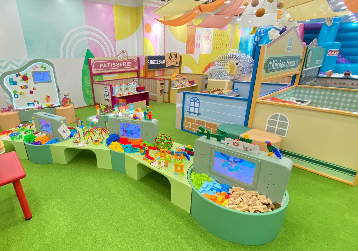 「キッズーナエリア」では、全身を使って室内でも思いきり体を動かして遊べるエア遊具や立体遊具、本格的なお店屋さんごっこが体験できる“なりきりタウン”、世界中から選び抜かれた知育玩具を集めたトイコーナーなど、子どもたちの「創造性」や「社会性」を育み、アジア諸国で多くのファミリーに愛される「キッズーナ」の魅力をふんだんに楽しむことができます。