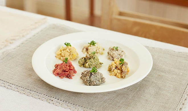 さまざまな食材を使用した7種類のメニュー:従来の7種類のメニューをそのままラインナップ。1つの商品に12品目以上、1週間で50品目 以上の食材を使用しています(※2)。愛犬の好みや体質に合わせて選択することも可能です。