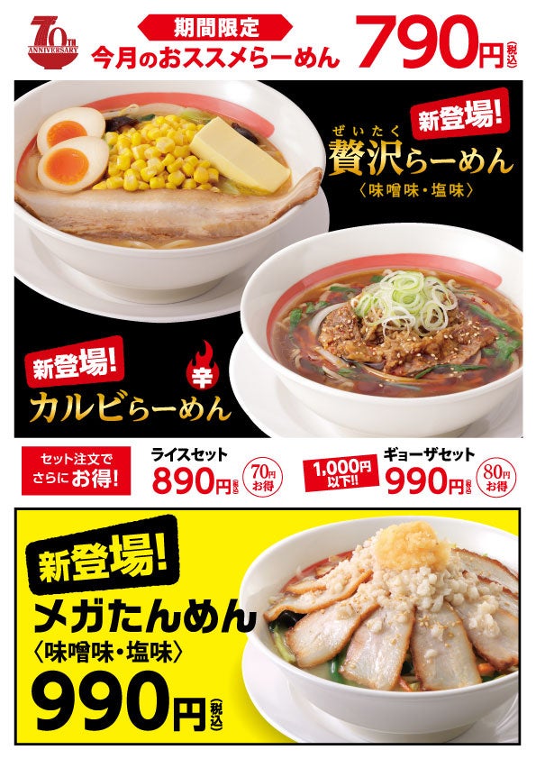甘辛い味付けの牛バラ肉をトッピングした「カルビらーめん」790円(税込)、人気上位のトッピングを使った「贅沢らーめん」790円(税込)、たっぷりの野菜とチャーシュー10枚にニンニク、背脂を乗せた「メガたんめん」990円(税込)を期間限定で販売開始いたします。「カルビらーめん」と「贅沢らーめん」にはお得なライスセット890円(税込)、ギョーザセット990円(税込)もご用意いたしました。