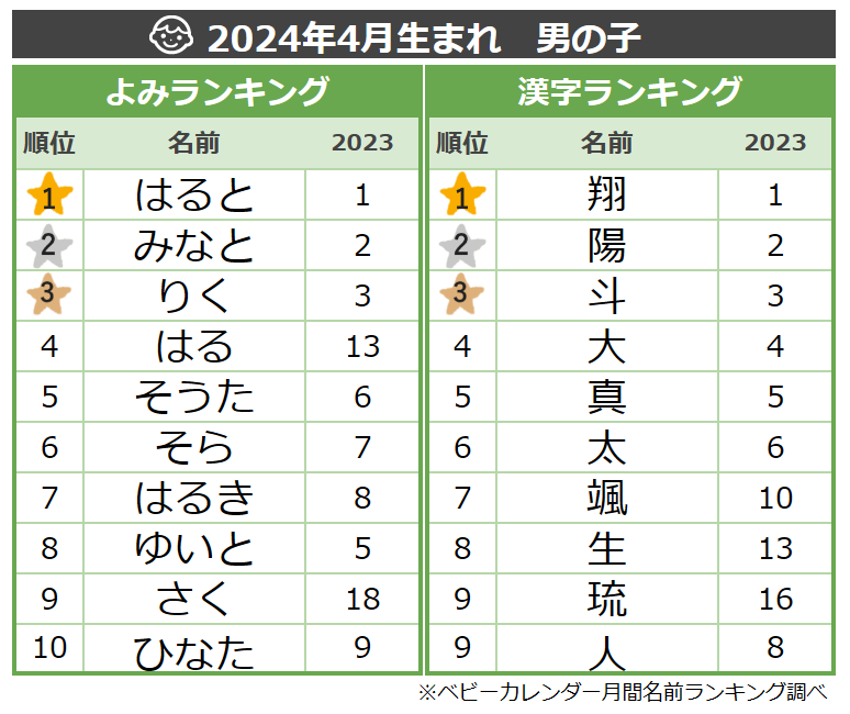 4月に生まれた男の子の名前の漢字ランキングTOP3は、1位「翔」、2位「陽」、3位「斗」で、3月と同じ結果に。3文字とも4カ月連続TOP3にランクインしており、男の子の名付けでは根強い人気となっています。