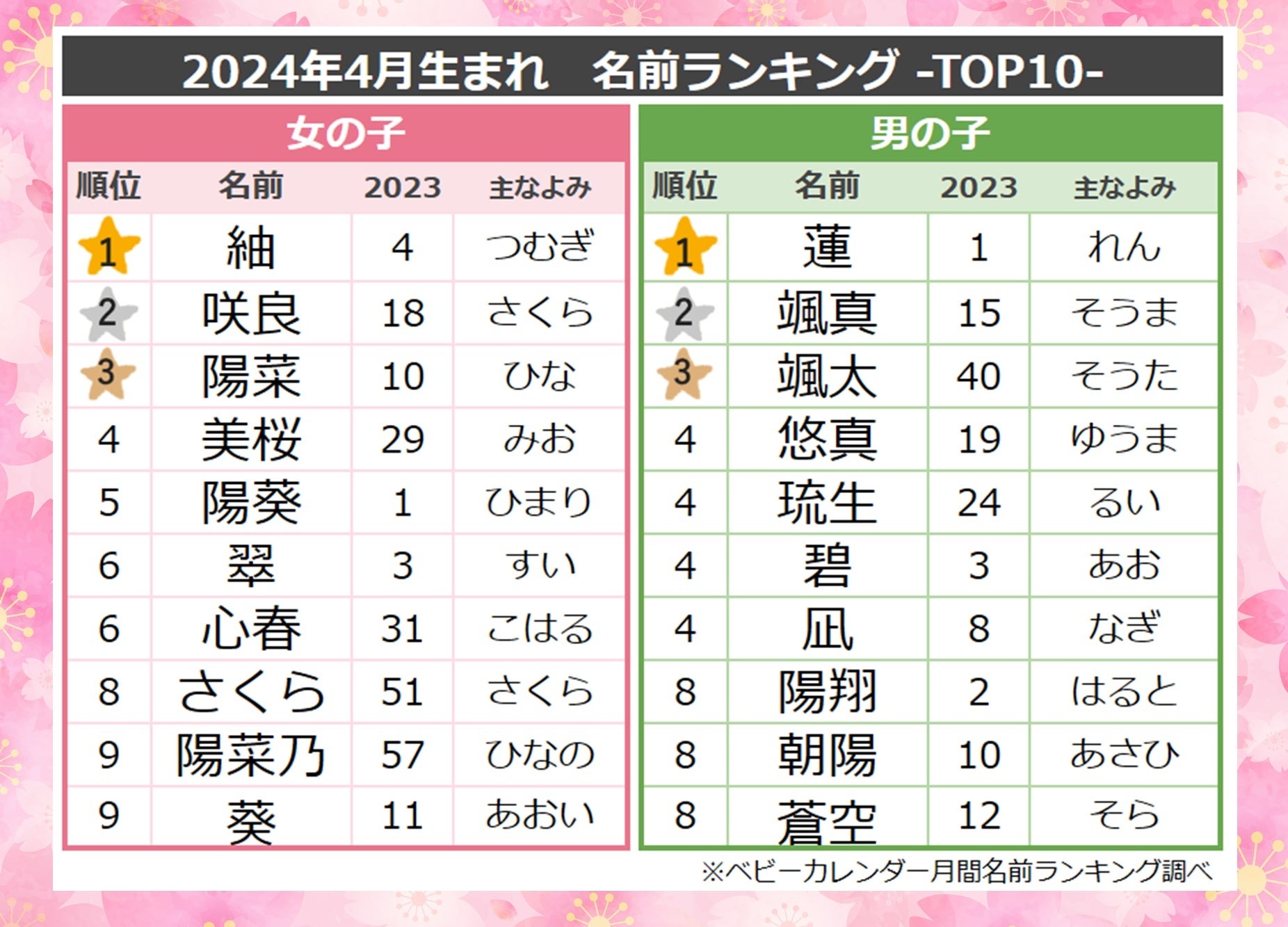 ▼4月生まれの赤ちゃんの名前ランキングTOP10