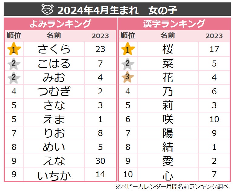 4月のよみランキングTOP3は、1位「さくら」、2位「こはる」・「みお」と、春らしさを感じる名前「春ネーム」が独占しました。桜を連想させる名前「サクラネーム」の代表格「さくら(人気の名前:咲良・さくら)」や「みお(人気の名前:美桜・未桜)」、春を連想させる「こはる(人気の名前:心春・心陽)」といった、季節感溢れるよみが人気を集めました。