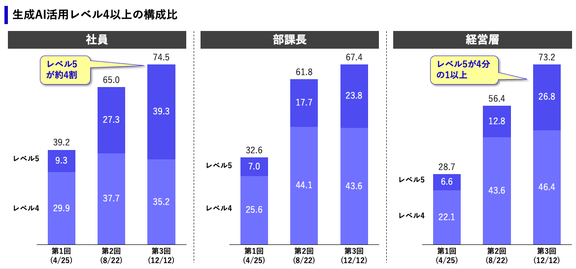 レベル5は31%と初回の7%から大幅に増えました。レベル4を合わせると約7割と、業務で積極的に利用している層が着実に増えていることがわかりました。