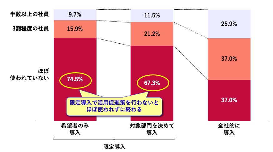 全社的に導入している企業ではそれが37%と30ポイント以上大幅に減るため、まずは全社的に導入することで社内の活用機運を後押しできると考えられます。全社で導入することで、利用機会が幅広く提供されて社内での認知が進み、活用のリテラシーが高い利用者を中心に自発的な利用が進むことなどが要因として挙げられます。