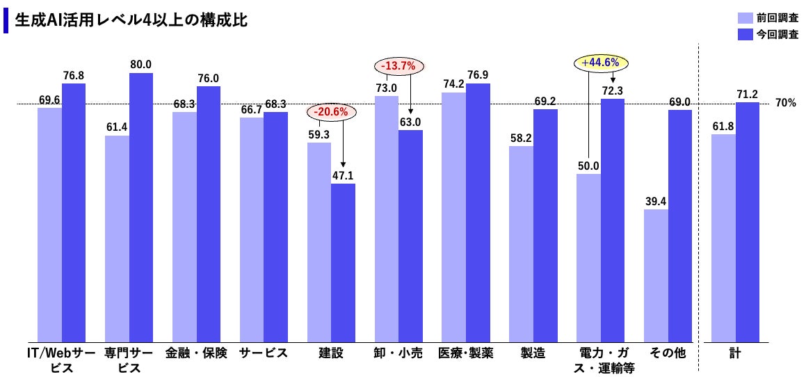 各業種ともレベル4とレベル5の活用層の合計が約7割となり、「電力・ガス・運輸」が72%と前回より20ポイント以上大きく伸び、「製造」も10ポイント増えています。一方、「建設」や「卸・小売」は前回よりも減少しています。調査対象が同様ではないものの、全社や業務ごとの利用の定着に向けた課題が垣間見られます。