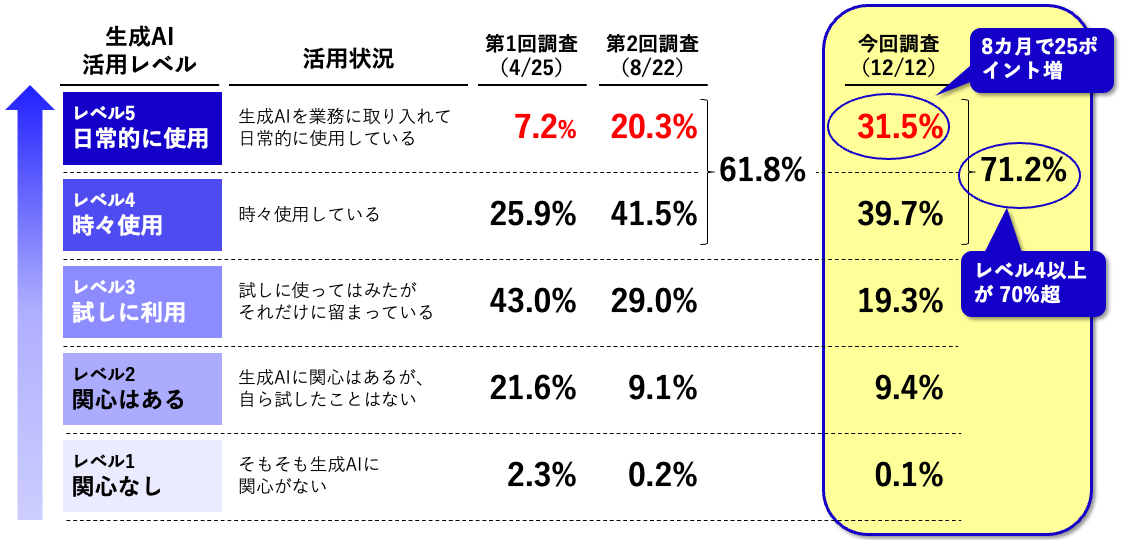 ☑︎活用状況を5段階に分類 〜業務で日常利用は7%から31%に、レベル4以上が7割に〜