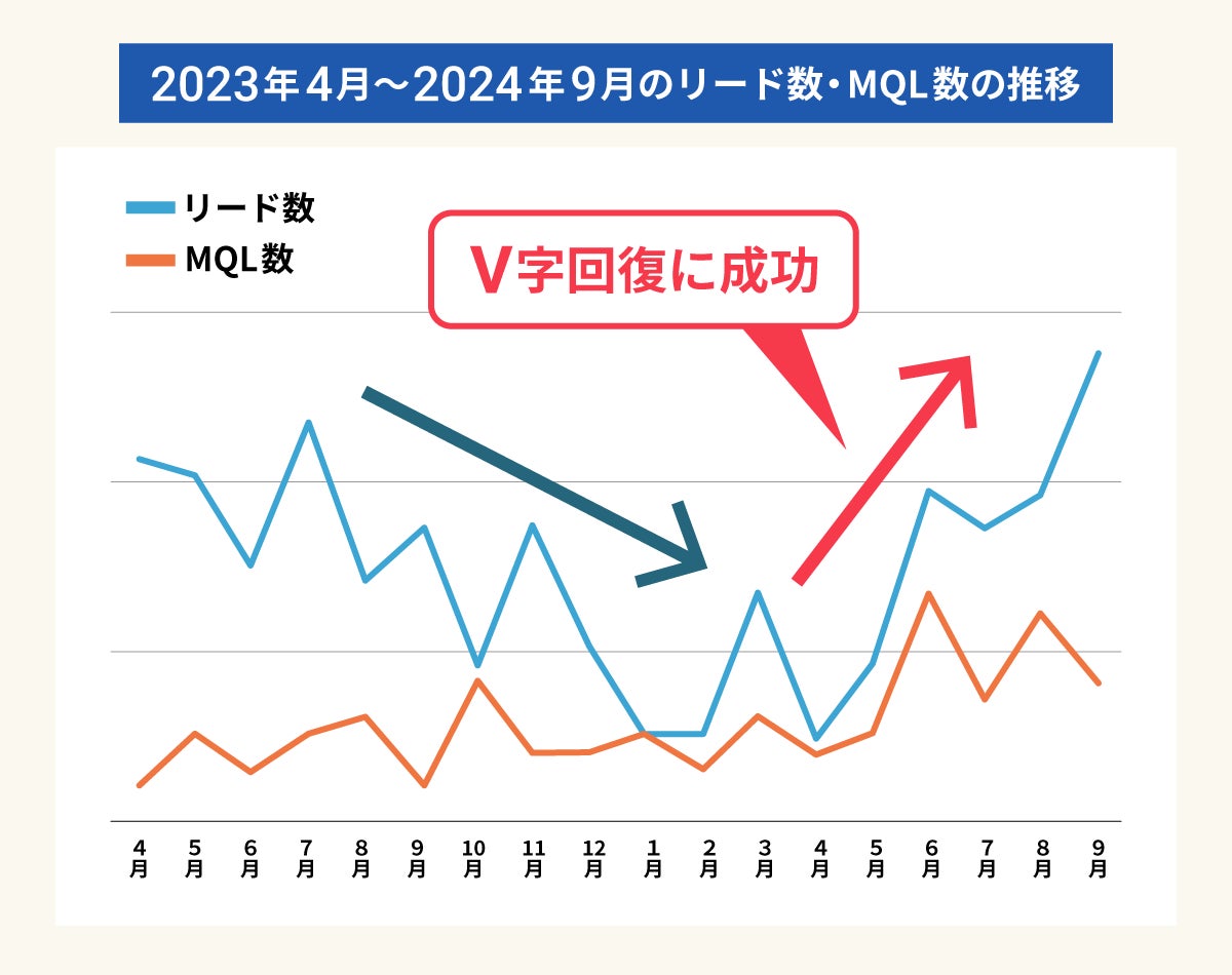 その結果、目標数字をはるかに超える結果となって驚いているといいます。例えば、キーワード「アプリ開発 会社」はリライトによって順位が5位から1位に向上。主要キーワードの順位が上がったことで、MQLの目標数値を達成することができました。2024年上期の時点で、リード数は昨対比1.4倍、商談獲得数は昨対比4倍まで増加しています。