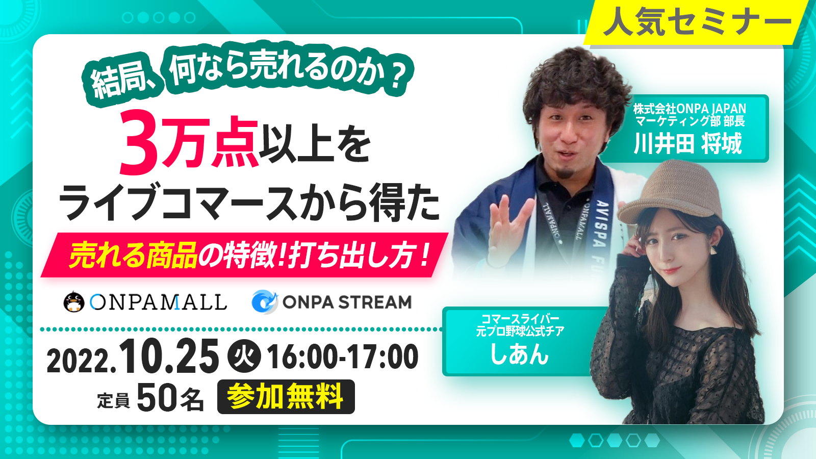 株式会社ONPA JAPAN(東京都渋谷区、代表取締役:恩地 佑亜 /以下、ONPA JAPAN)が無料ウェビナー(アーカイブ)を配信いたします。ライブコマースに興味のある方や新たな販売方法をご検討中の企業様向けのウェビナーです。