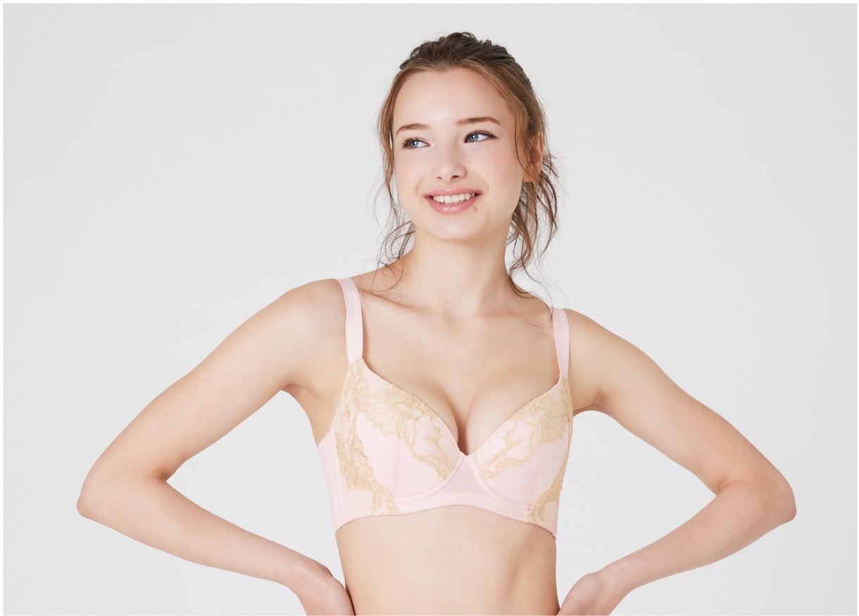 優しいピンクにシャンパンベージュの繊細なレースが輝き、ラグジュアリーな雰囲気を醸し出してくれます。ときめくカラーリングでバストを飾って、下着もファッションも楽しんでください。