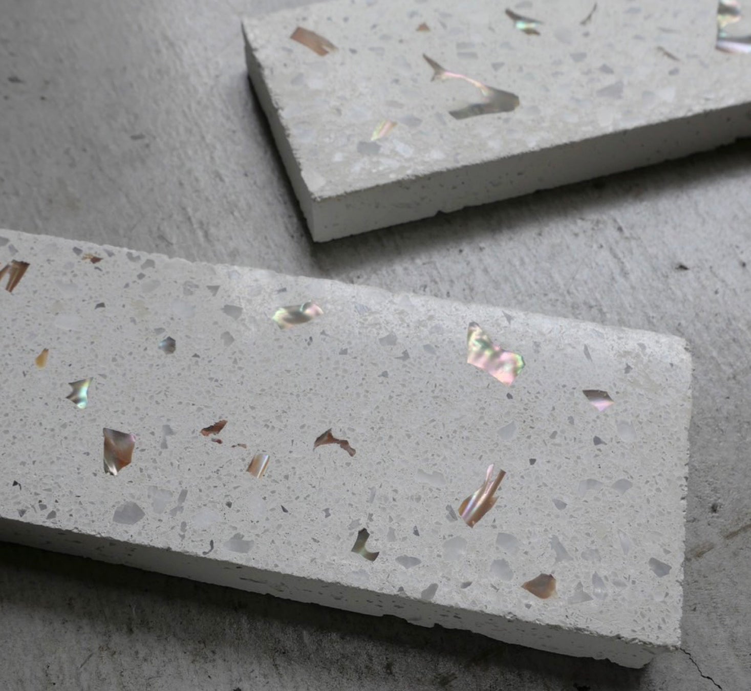 店舗デザインは、伝統を重んじながらも洗練された華やかさと品格が漂う銀座の街並みを、自然素材の美しさで表現しました。手前の平台や奥の棚の仕上げには、アワビの殻を再活用した研ぎ出しタイルを採用しています。2024年4月にオープンした、北海道長沼町にある一棟貸しの宿泊施設「MAISON SHIRO」でも、廃棄予定だったホタテの殻を粉状に加工し、モルタルに混ぜ込んで使用しました。ホタテは収獲量が多く*、かつてはその殻の大量廃棄が土壌汚染の原因となっていましたが、現在では塗料や壁材をはじめとする建築資材、アスファルトなどに用いられている他、主成分である炭酸カルシウムに除菌・抗菌作用があるので、石けんや洗剤などにもリサイクルされています。
