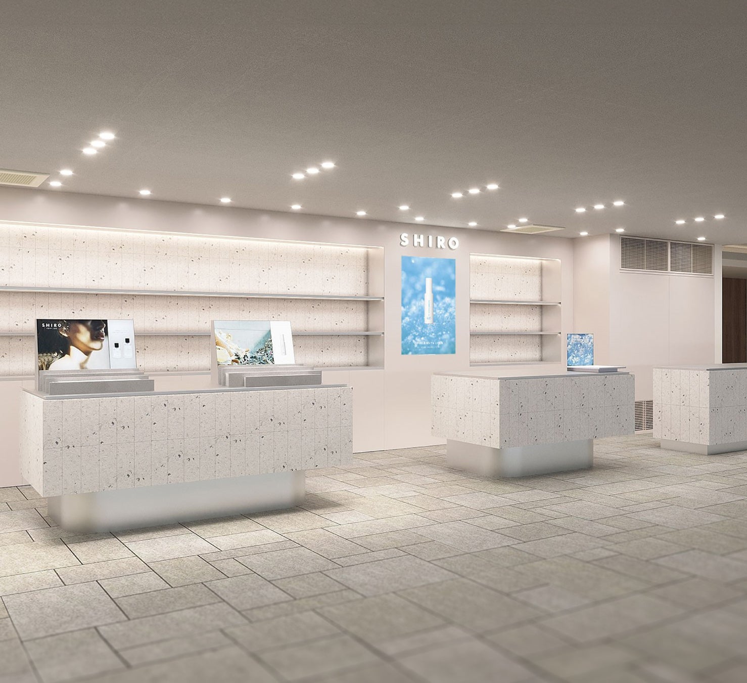 「SHIRO 銀座三越店」はこのたび、同エリアにてリニューアルオープンいたします。既存の什器や壁面棚を活かしながら、よりお客様がお買い物をしやすい空間へ。左官材には廃棄されるはずだったアワビの殻を混ぜ込み、自然素材の美しさにプロダクトが映える店舗となります。